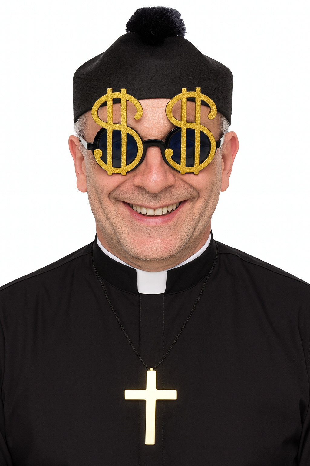 Перевдягання вбрання, біретка, капелюх, намисто, хрест, окуляри, атрибути священика