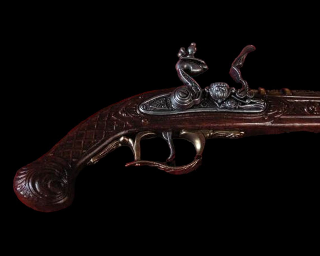 Кремінний замок і ствол, орнаментований хвилястими стрічками, відлиті зі сплаву алюмінію та цинку.