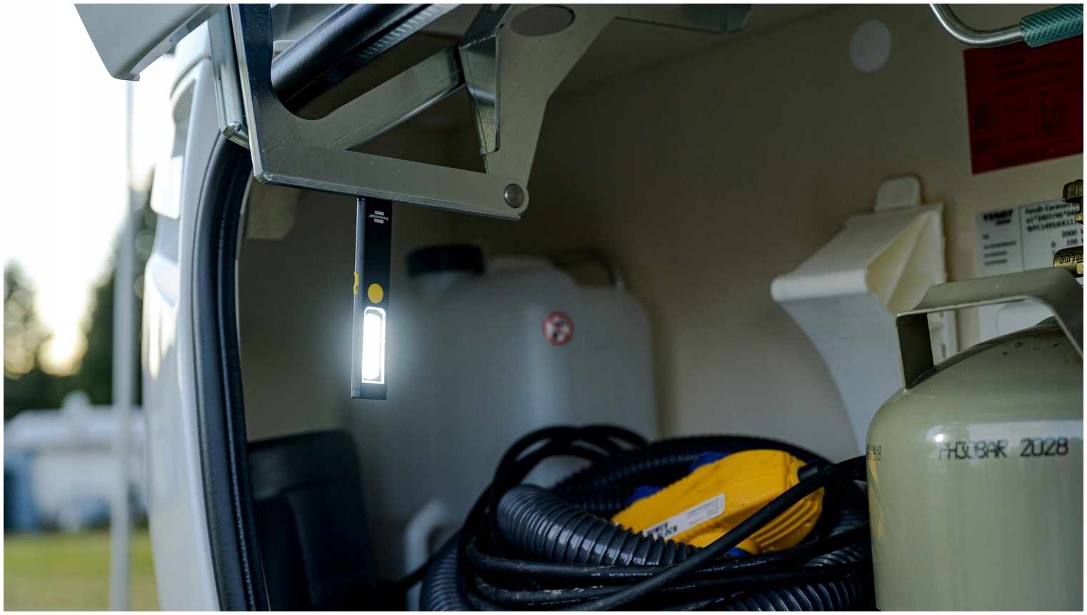 Він має практичний затиск на задній панелі та магніт у монтажній основі, тому його можна гнучко прикріпити. Оглядова лампа з інтегрованим акумулятором Li-Pol (3,7 В / 450 мАг) з індикатором заряду має п'ять різних режимів освітлення b>
