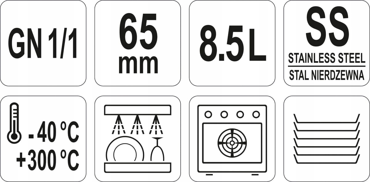 Професійний перфорований контейнер GN з нержавіючої сталі Yato з розмірами Gn 1/1, 65 мм , ємність 8,5 л .