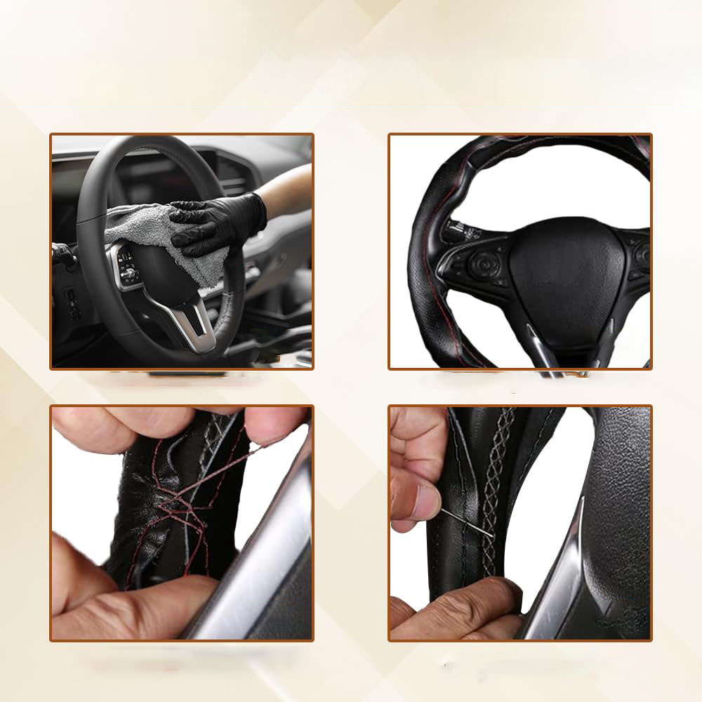 【Шиття має сенс】: Наш виріб попередньо зшитий дизайн, включає в себе пакет шкіряного чохла на кермо, 4 шт в’язальних ниток (2x червоні, 2x чорні) і 4 штод. швейні голки, просто оберніть голку навколо стібка, вшитого в кобуру. Пошиття чохла на кермо може зайняти багато часу, але кінцевий результат точно вартий кожної копійки. Це також задоволення, яке наближає вас до вашого улюбленого автомобіля.