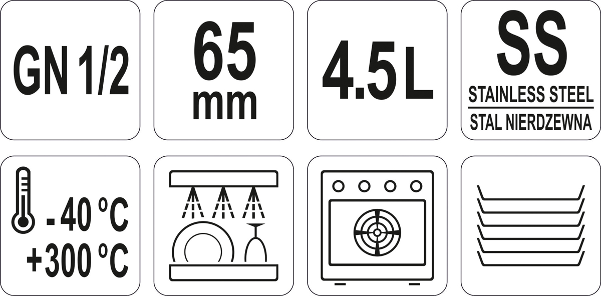 Розміри контейнерів відповідають стандарту GASTRO NORM PN-EN 631-1:1996, що означає, що їх розміри точно вказані: