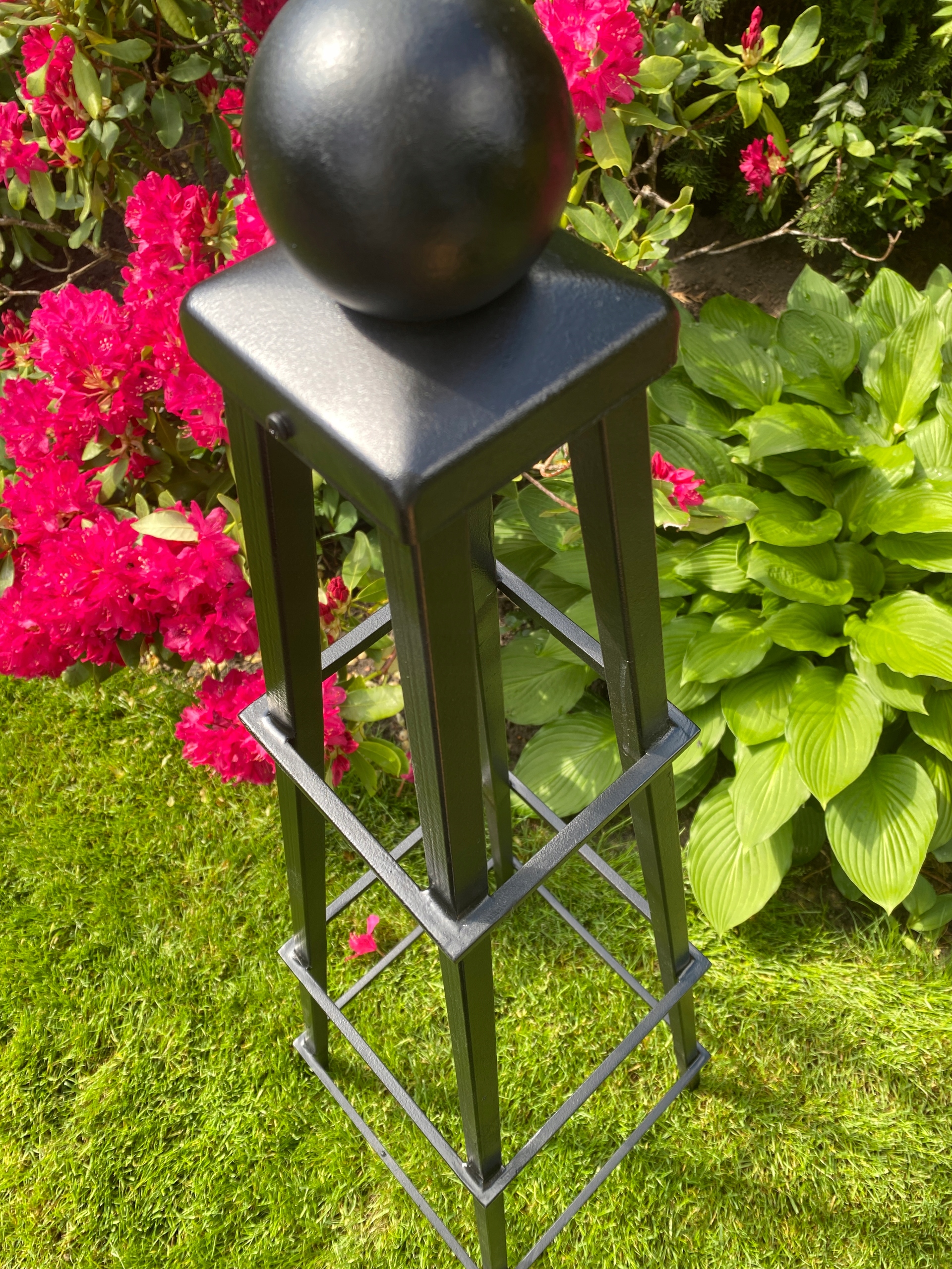 Сучасна споруда у формі обеліска, оброблена сталевою кулею, додасть елегантності вашому саду.