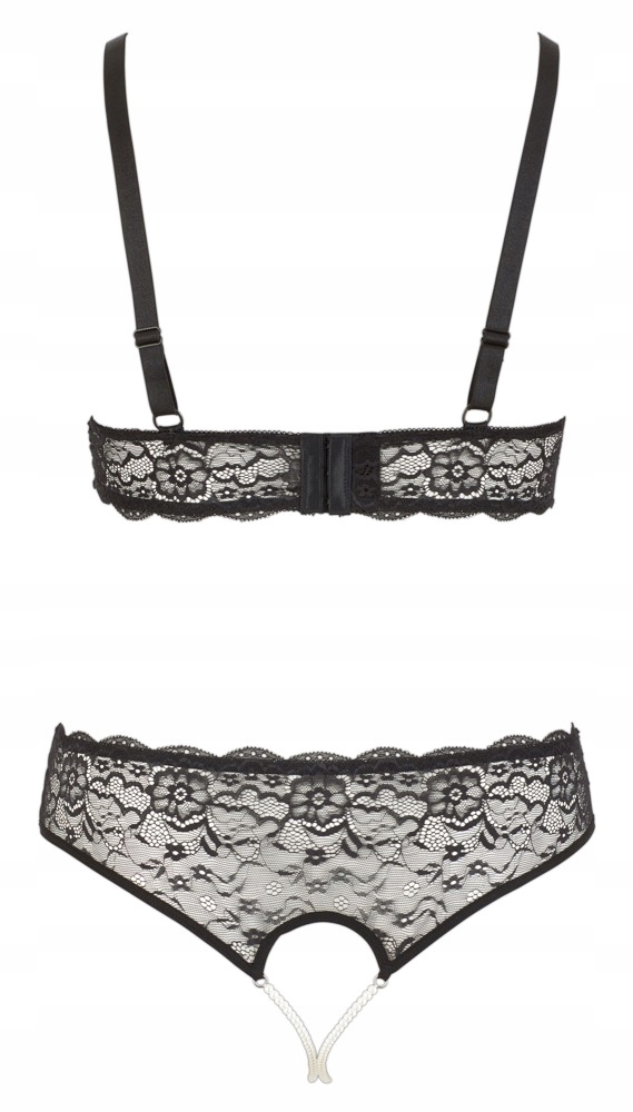 Ніжне мереживо в поєднанні з декоративними прикрасами з перлів! М’який бюстгальтер із застібкою на гачки та вічка ззаду та регульованими бретелями вражає відкритими чашечками та перлинними ланцюжками над бюстом, а 2 перлинні ланцюжки проходять через повністю відкриту промежину стрінгів