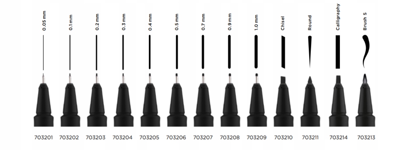 - Діапазон захватів від 0,05 мм до 1 мм, додатково скошений, круглий, для каліграфії та у вигляді пензля.