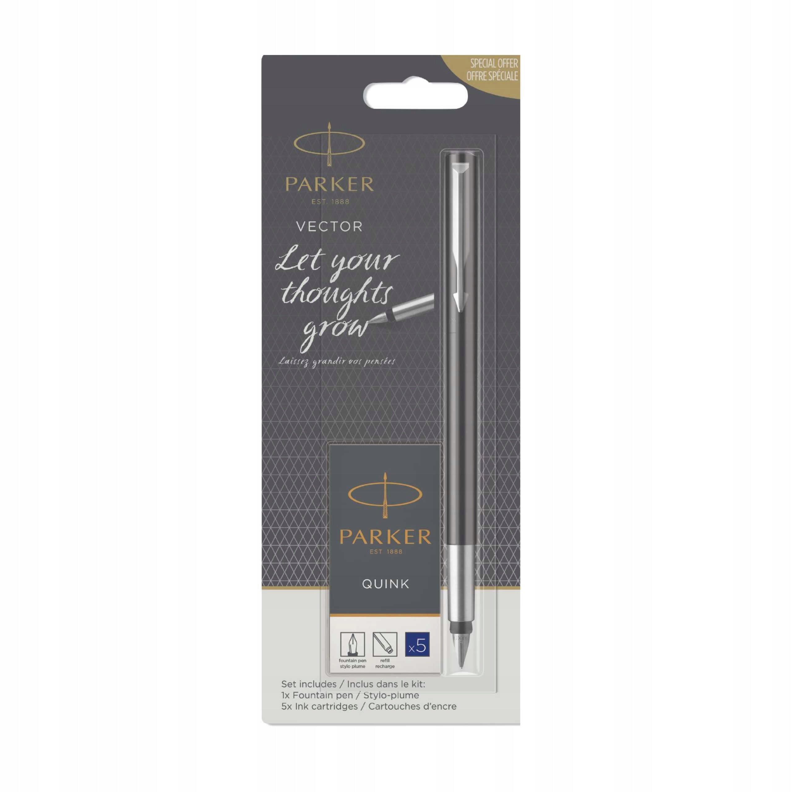 Перова ручка Parker Vector характеризується класичною елегантністю з сучасним покриттям. Завдяки тонкій, простій та ергономічній формі користуватися нею буде суцільним задоволенням. Корпус і кришка виготовлені з пластику, стійкого до подряпин. Перо розміру M — хороший вибір для людей, які хочуть отримати тонку та чітку лінію письма. Нержавіюча сталь, з якої вона виготовлена, робить її стійкою до пошкоджень, що в свою чергу робить саму ручку придатною, наприклад, для студентів. Форма наконечника розроблена як для правшів, так і для лівшів. Ручка працює як з картриджами Parker, так і з поршнем.