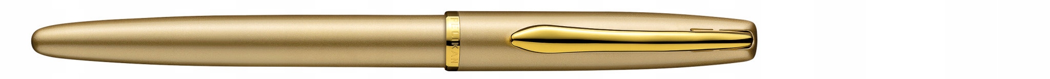 СУЦІЛЬНОМЕТАЛЕВА РУЧКА класичної простої форми. Перо, прикрашене логотипом Pelikan, середньої, найпопулярнішої товщини. МЕТАЛЕВИЙ тримач для перо. Корпус і ковпачок виготовлені з латуні, багатошарово пофарбовані. Корпус, кришка, накладка та наконечник пофарбовані в золотий колір.