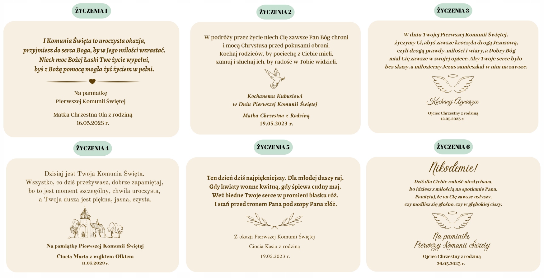 - Імена людей, які висловлюють побажання (наприклад, хрещена мати, дядько Дарек)