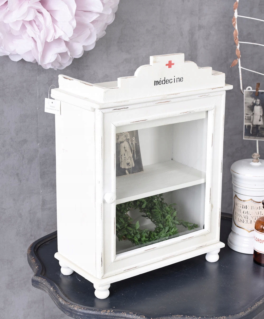 Це наступний аптечний кабінет. Світлі кольори, старий стиль буде виглядати красиво у кожній кімнаті. Звичайно, також варто витратити таку шафу для домашнього набору для першої допомоги - цілі гармонізуватимуть з ним.