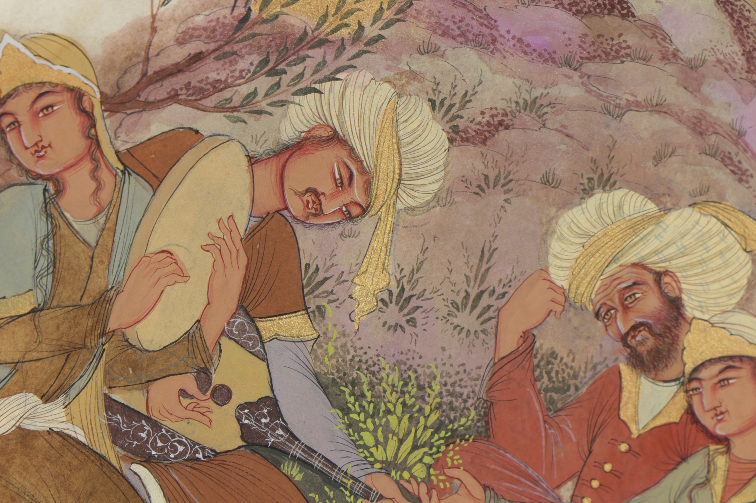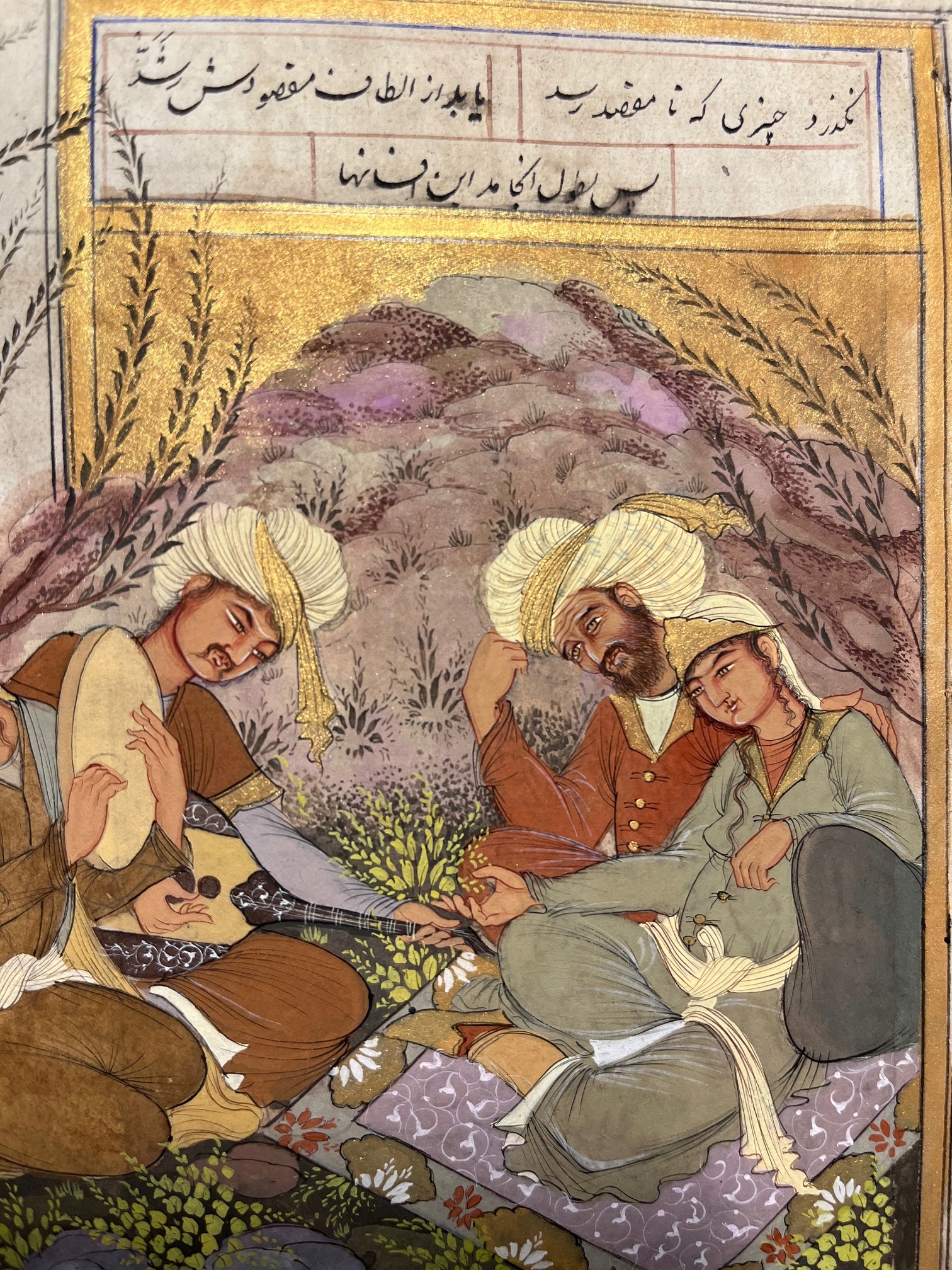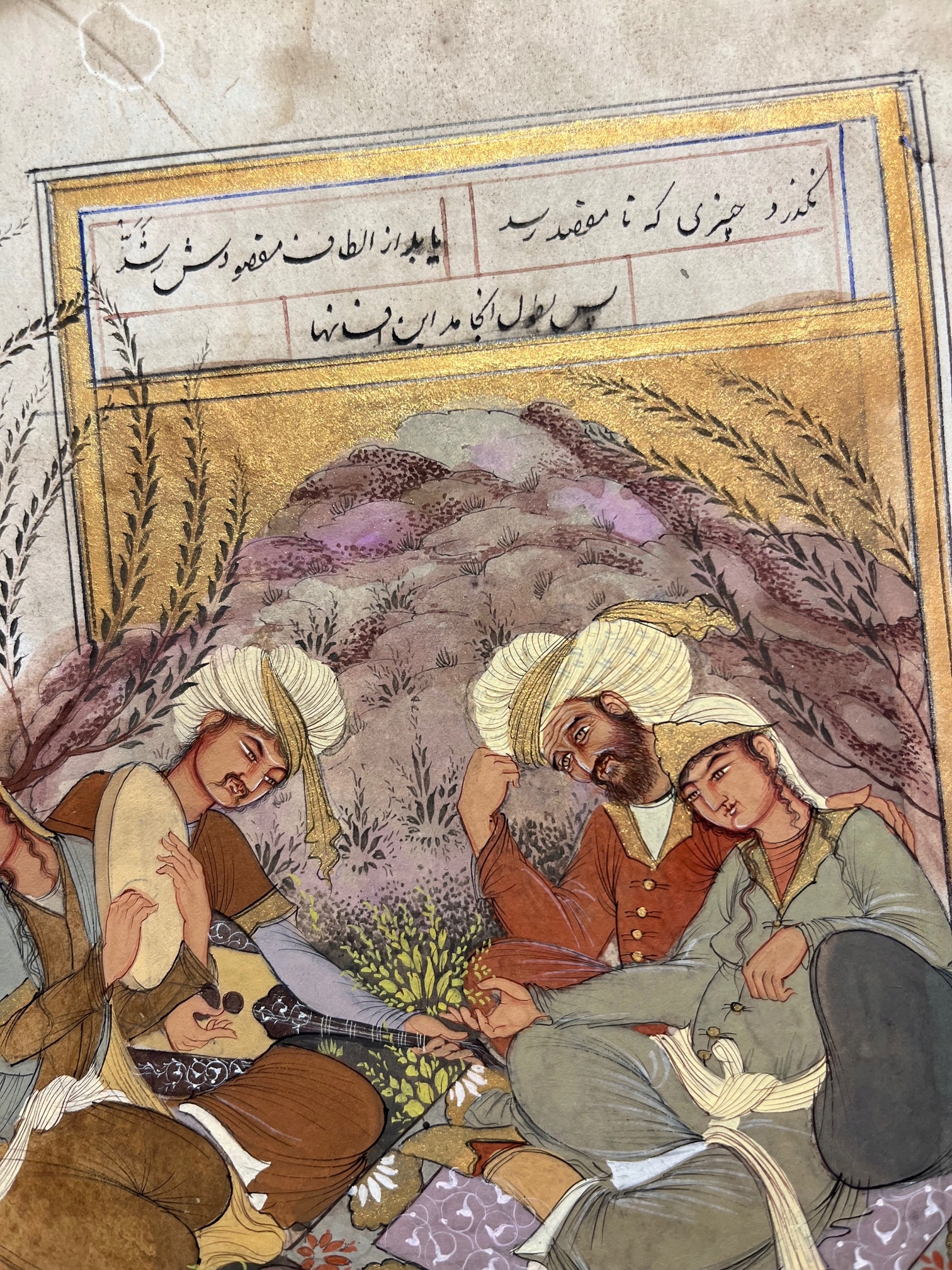 Одна сторінка ілюмінованого поетичного рукопису, що містить на аверсі барвисту мініатюру із зображенням сцени поетичної зустрічі в саду (меджлісі). Чотири фігури в багатих мантіях і тюрбанах сидять на килимах серед рослин і квітів. Двоє людей грають на інструментах (тамбур і даф), типовий мотив любовно-рефлексивної поезії періодів Сефевідів і Каджарів.