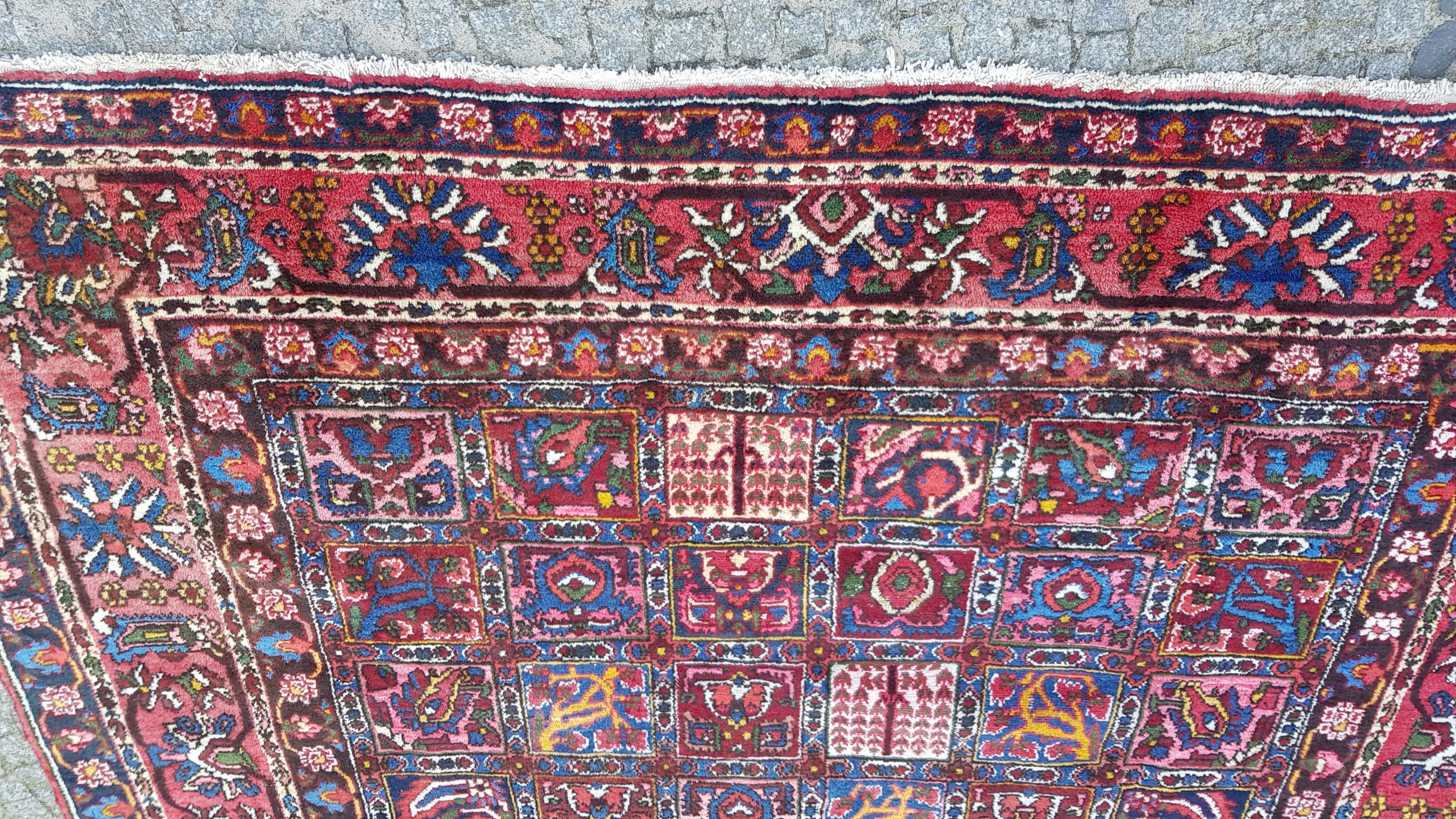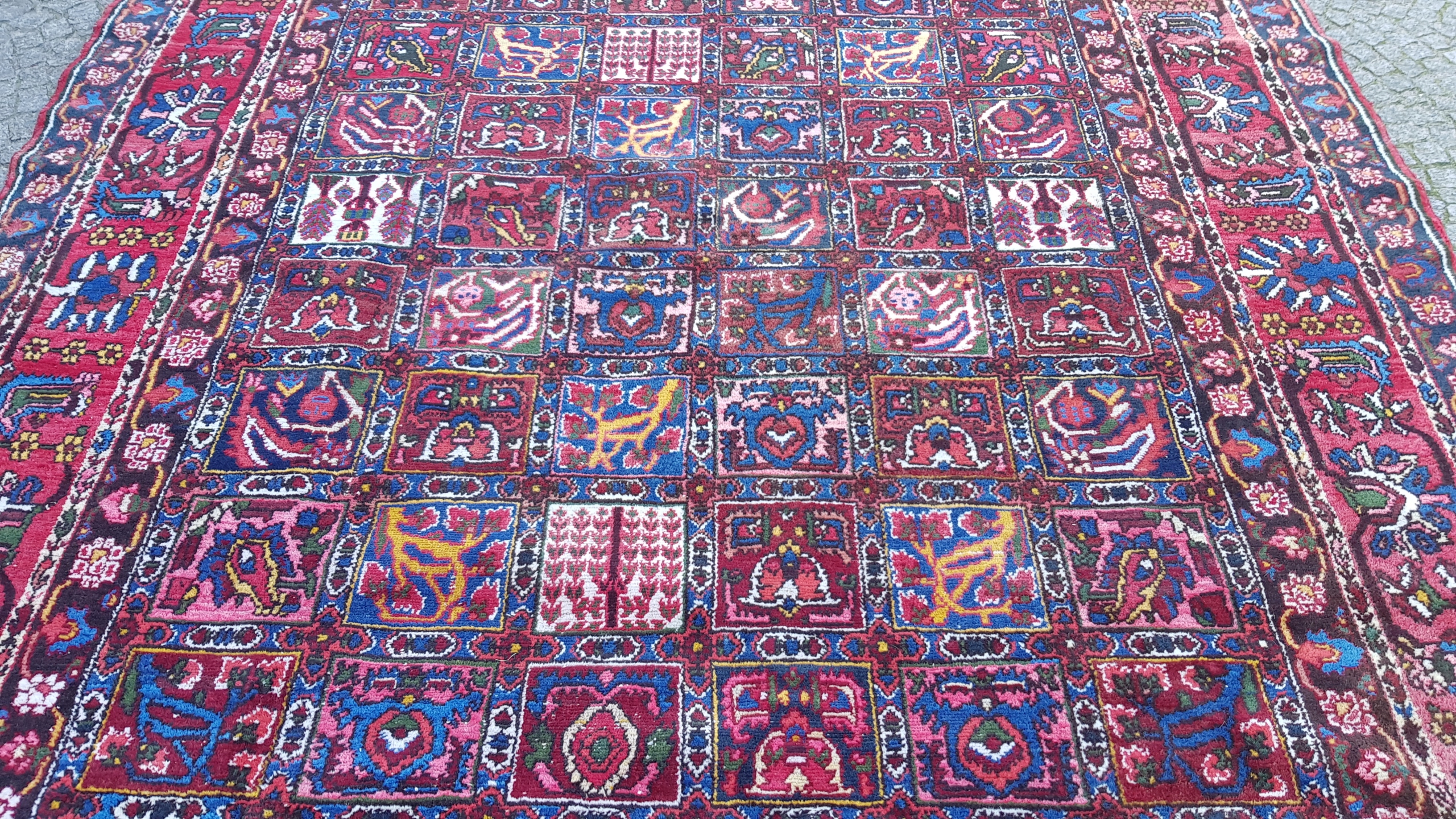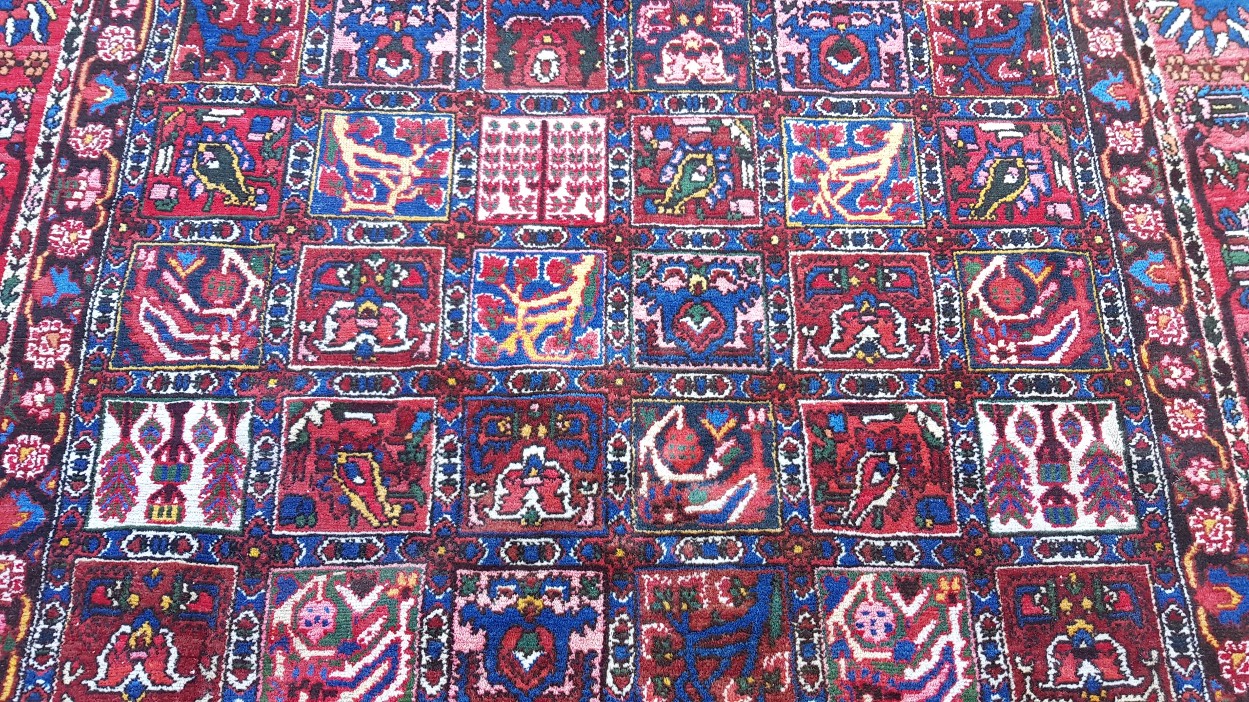 Перський килим Бактяр. Виткана вручну з вовни найвищої якості. Характеризується компактним, приємним на дотик флісом і красивими кольорами та візерунками. Зберігся в хорошому стані. Має місця з нижнім ворсом і невеликою асиметрією.