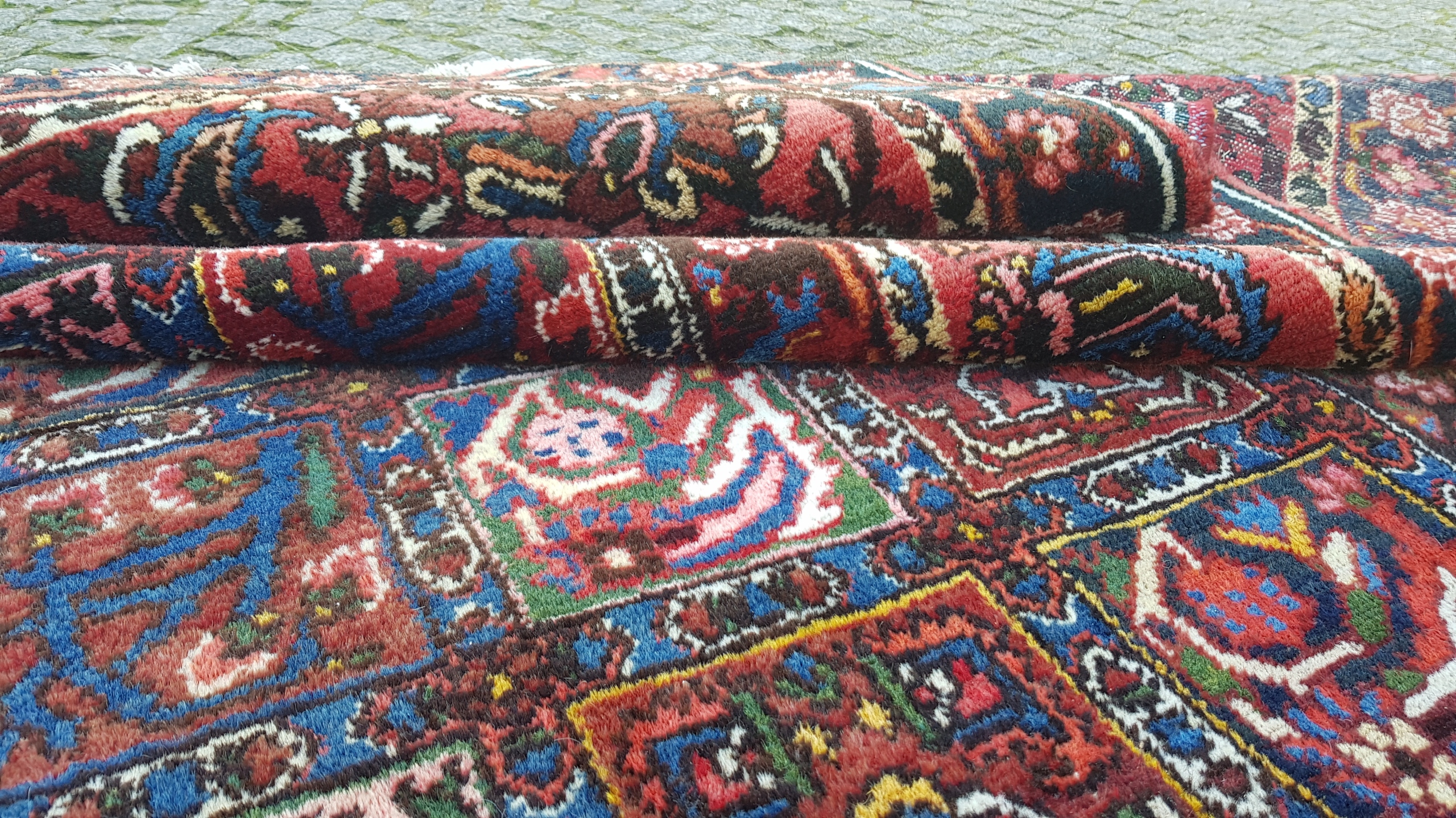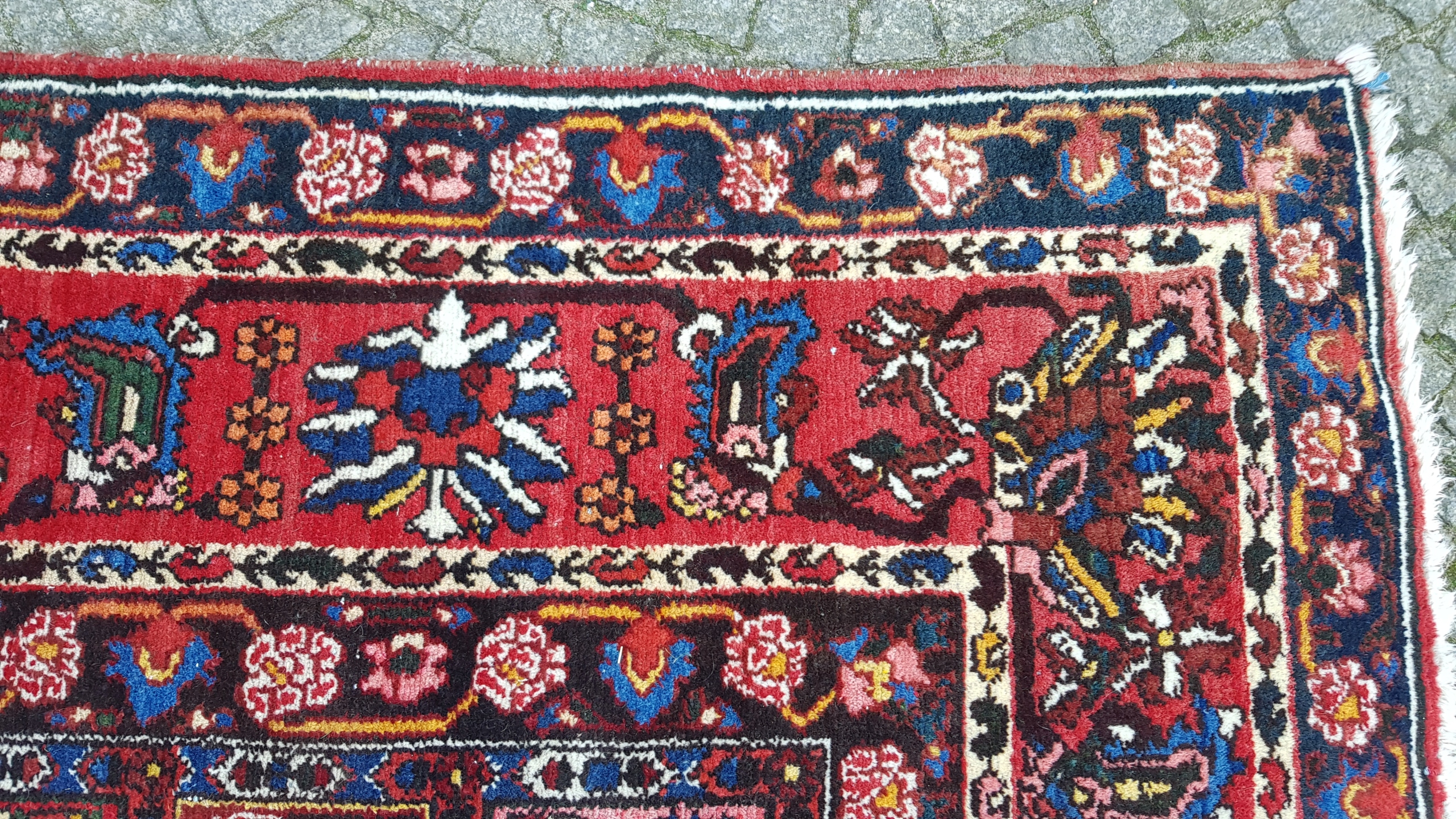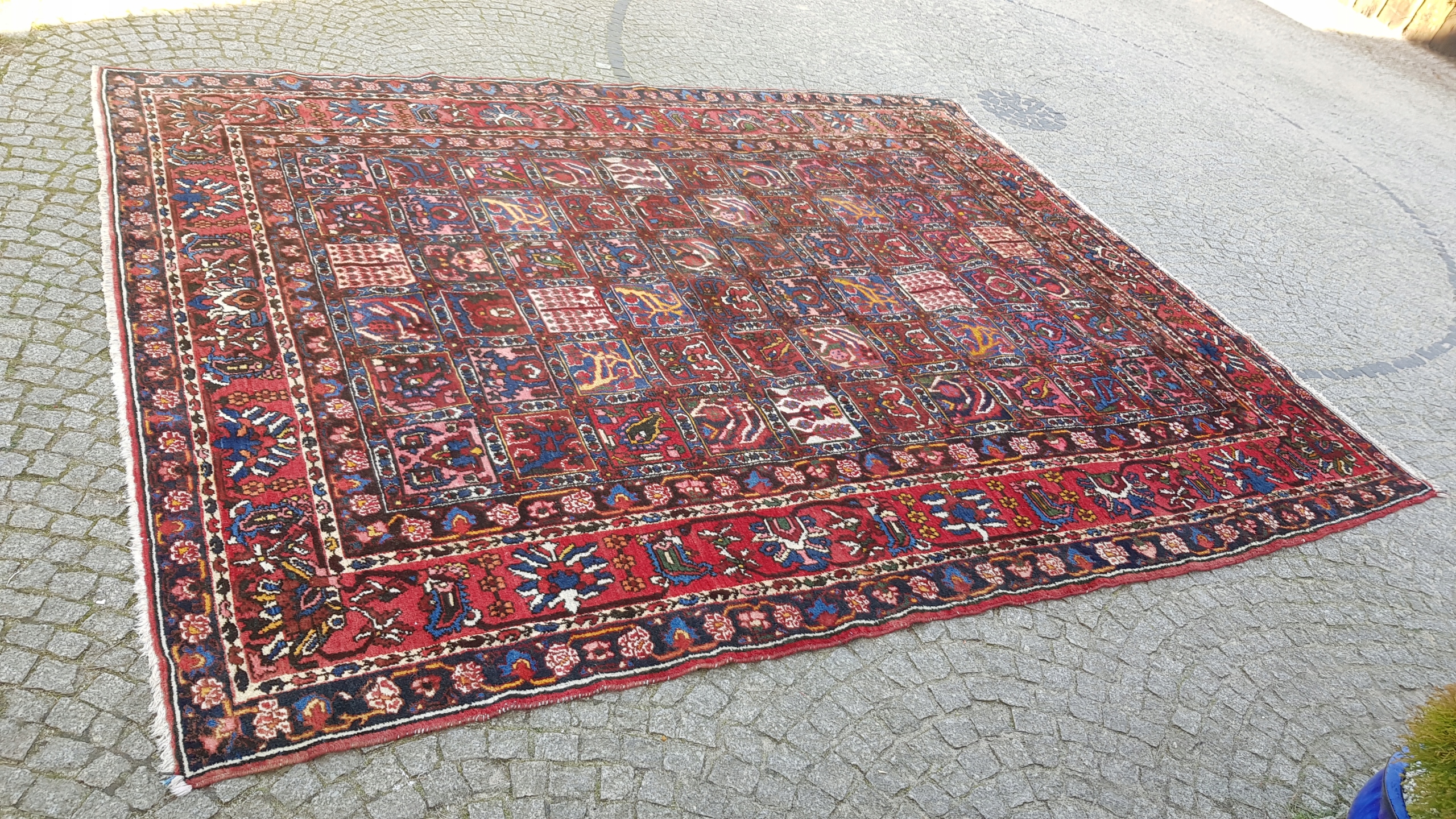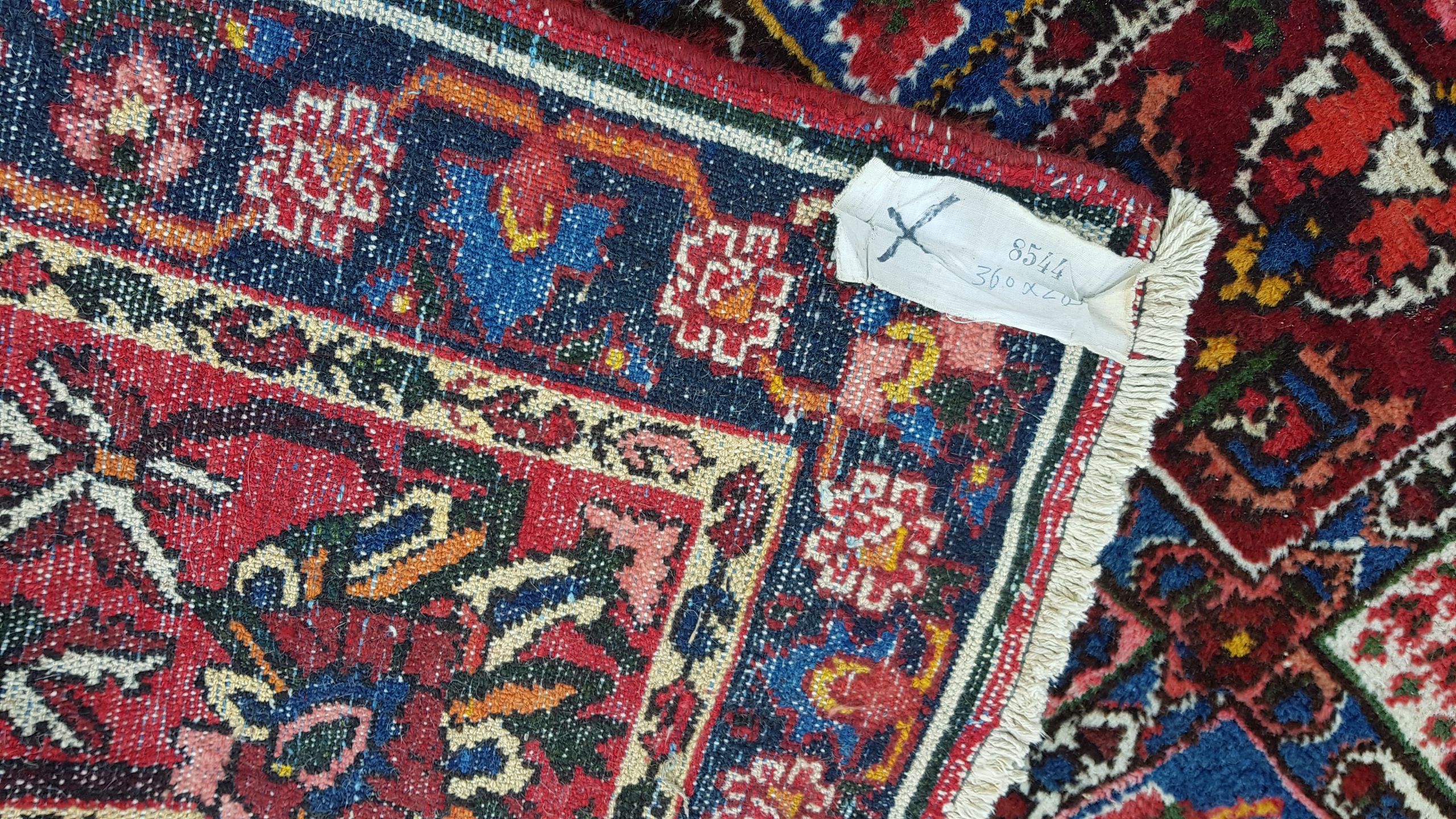 Перський килим Бактяр. Виткана вручну з вовни найвищої якості. Характеризується компактним, приємним на дотик флісом і красивими кольорами та візерунками. Зберігся в хорошому стані. Має місця з нижнім ворсом і невеликою асиметрією.