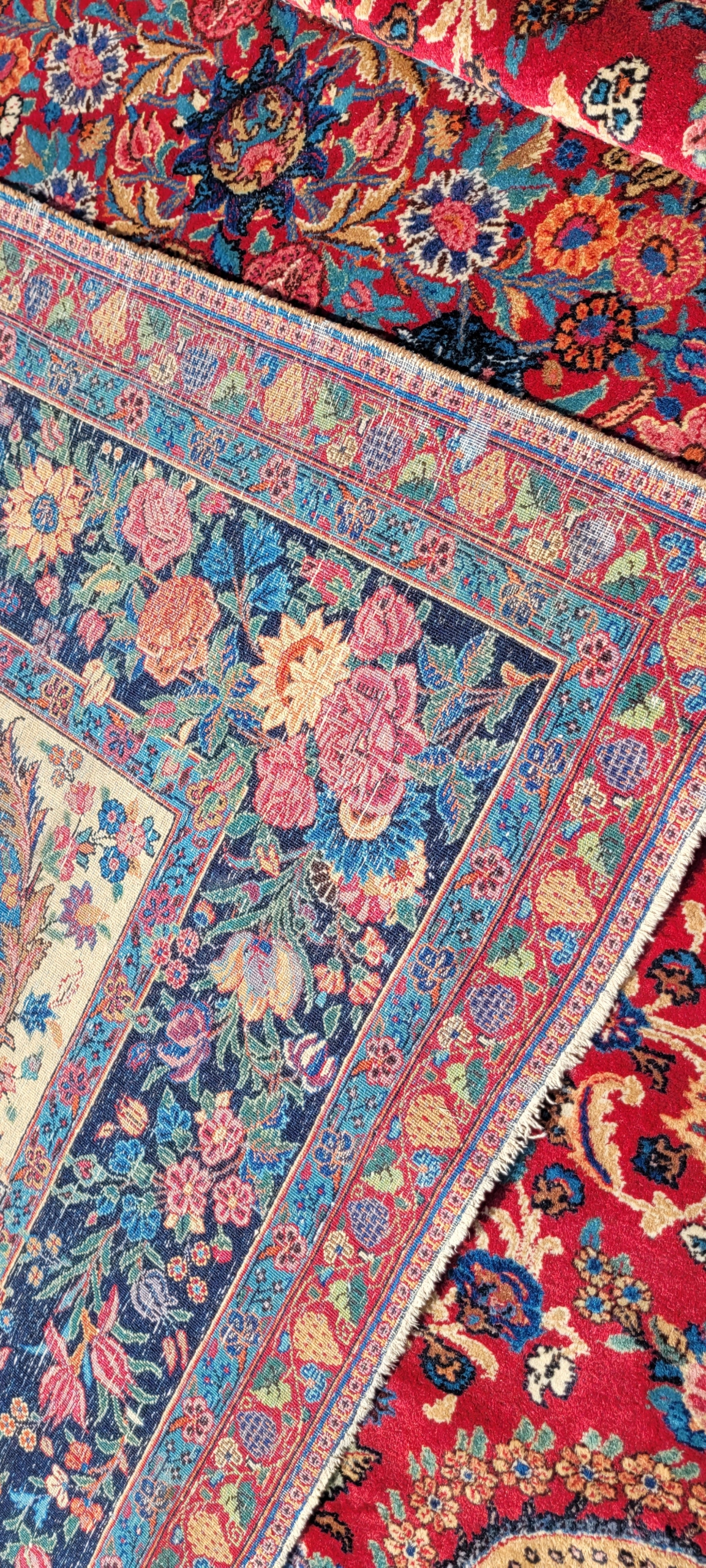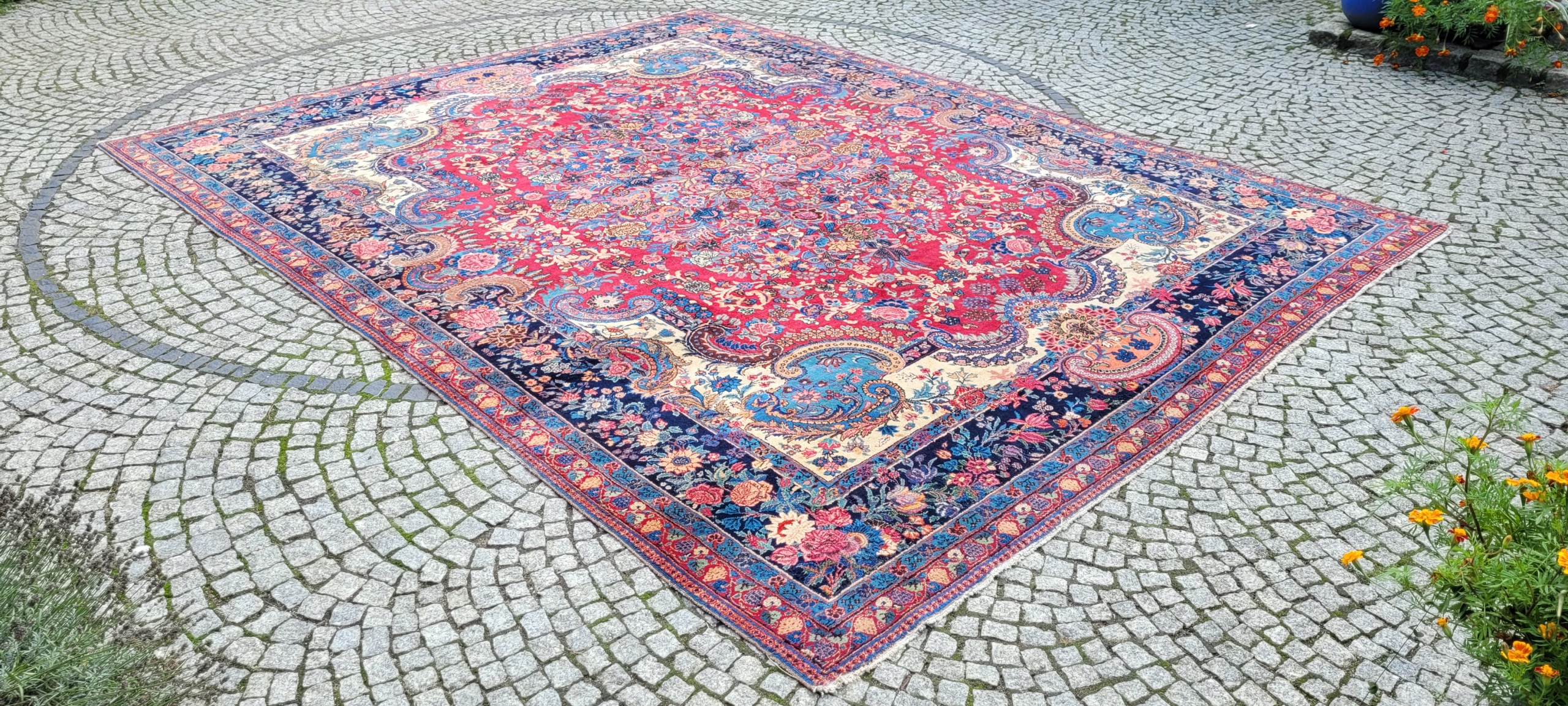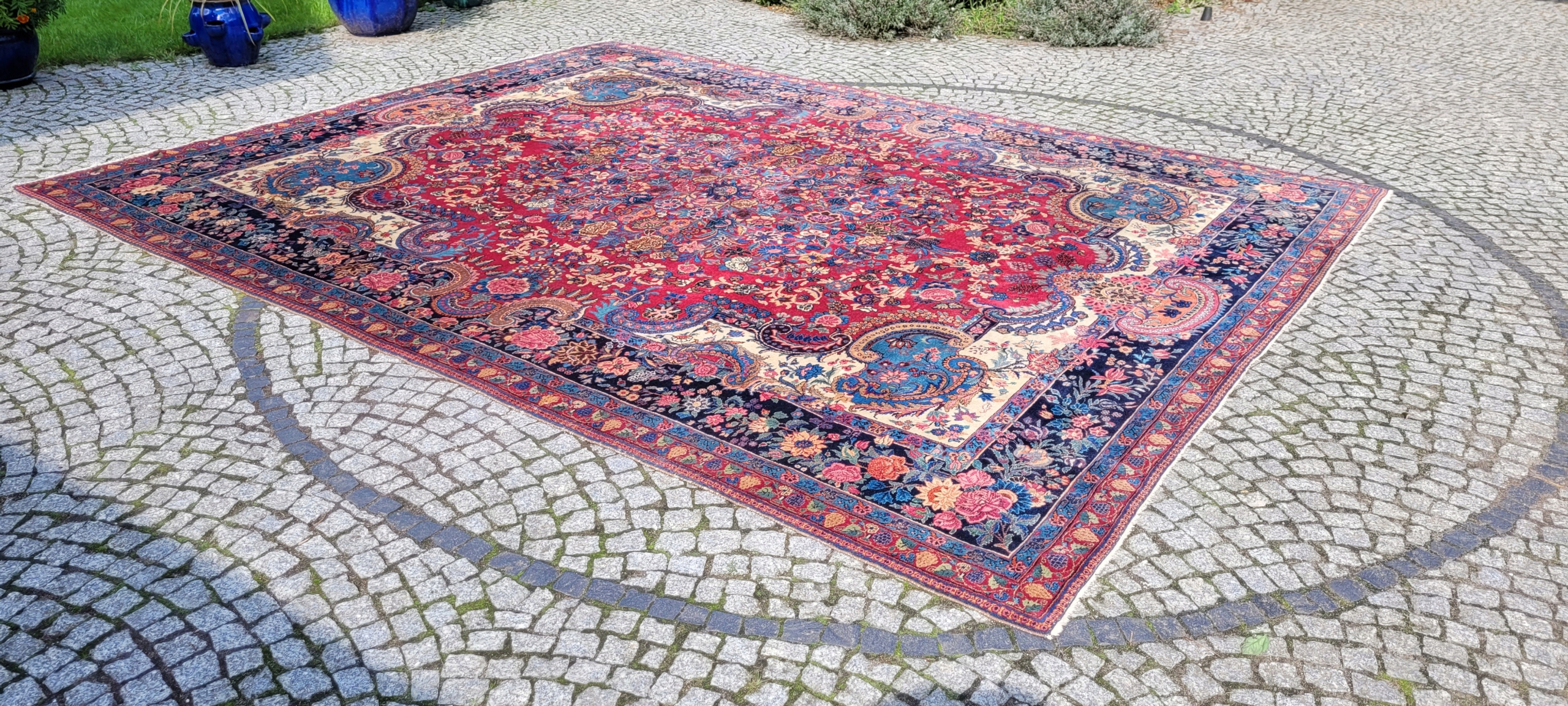 Це дуже якісний килим, витканий у Мешхеді, столиці провінції Хорасан, на південному сході Персії. Узори найчастіше являють собою медальйони з темним, червоно-синім і синім декором. Килими Мешхеда часто нагадують кешанські килими. Універсальні малюнки роблять цей килим підходящим для багатьох інтер'єрів.