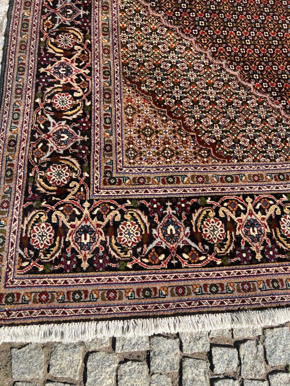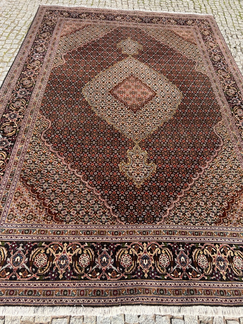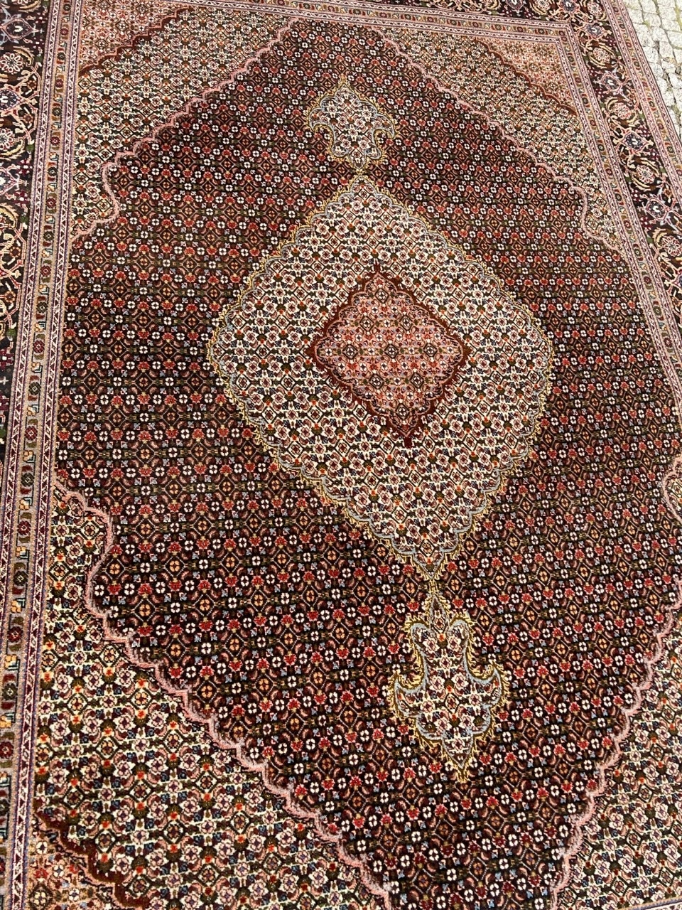 АРТИКУЛ: Перський килим ручної роботи. Оригінальна модель Made In Iran з провінції Тебріз Радж. Є бирка під килим + паперовий сертифікат під замовлення. У галереї він коштував 7 500 євро, тобто близько 31 000 злотих. Він унікальний візерунком із центральним медальйоном, а також кольором (чорний фон)