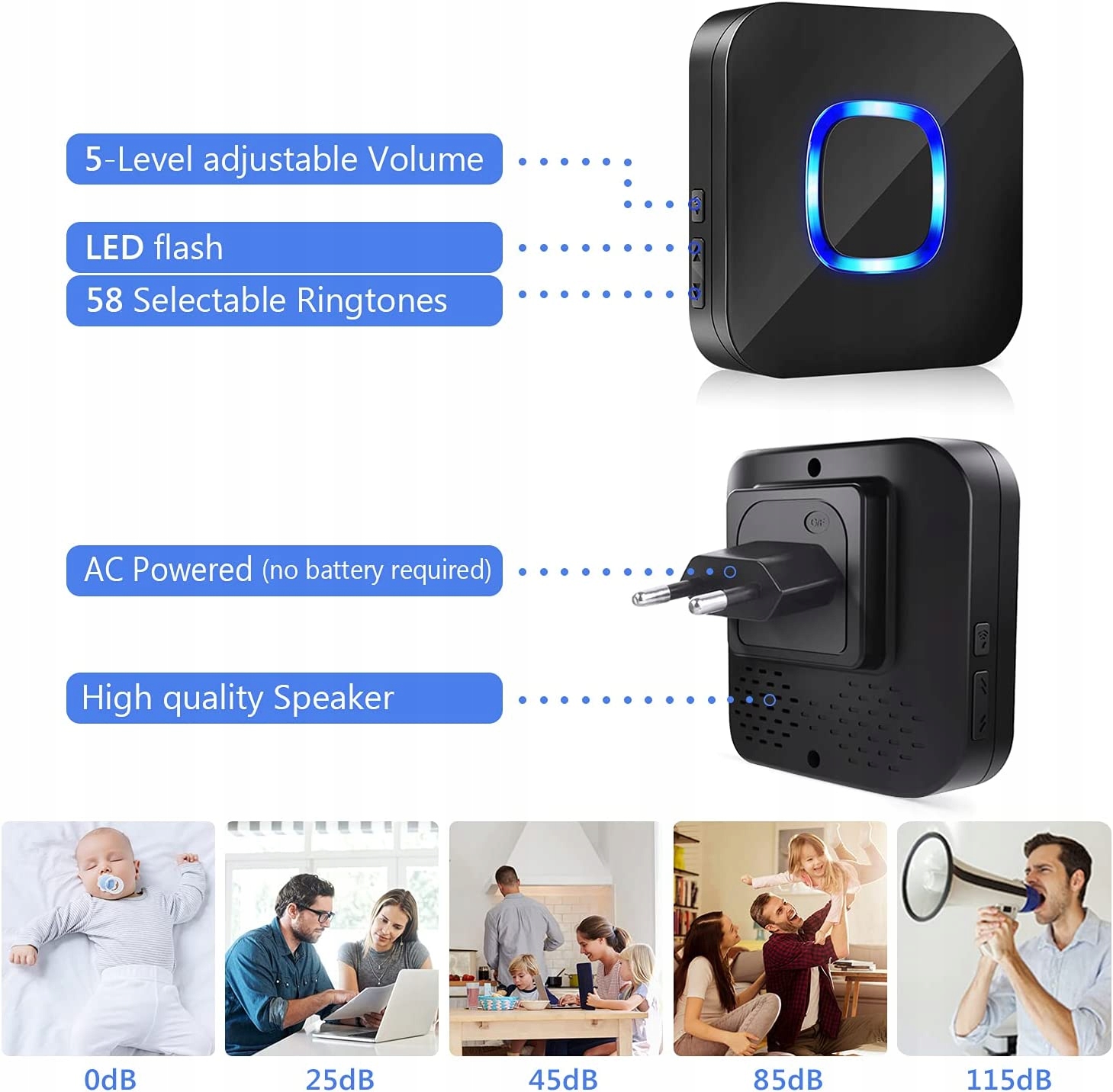 Диапазон 300 м і потужний сигнал на відкритому просторі можуть досягати потужного радіосигналу вдома чи в офісі 300 м 300 м. Два приймачі Plugin не заважають жодним іншим пристроям у вашому домі чи сусідів, сигнал може дуже добре долають перешкоди. Якщо ви відпочиваєте в спальні, прополюєте в саду або готуєте їжу на кухні, ви чітко почуєте дзвінок. Порада Металеві дверцята блокують сигнал і скорочують робочу відстань58 дзвінків і 5 рівнів гучності 58 типів красивих музичних звуків на вибір 5 типів регулювання гучності мін. Гоно вимкнено. Якщо ви не хочете турбувати сплячу дитину, ви можете вимкнути її звук. Максимальна гучність може досягати 115 дБ, навіть коли ви святкуєте вдома, дверний дзвінок може проникати крізь двері та вікна. Бездротовий дверний дзвінок BITIWEND може задовольнити різні вимоги в різний час і в різні випадки. Комплект бездротового дверного дзвінка зі світлодіодним індикатором Щоразу, коли хтось натискає кнопку передавача, бездротовий передавач і приймач засвітяться в колі. Якщо ви носите навушники або беруші, він сповістить вас за допомогою миготливого світлодіода в квартирі. Світлодіодні покажчики повороту — чудова функція для людей із вадами слуху. Ви не пропустите жодного гостя. IP55 Супер водонепроникний і водонепроникний, відповідає класу захисту IP55 і дуже водонепроникний. Добре працює під сніговим дощем або при екстремальних температурах 30C-70C. Завдяки цьому бездротовий дверний дзвінок BITIWEND також можна використовувати як садовий дзвінок. Підказки На передавач можна покласти маленький аркуш паперу зі своїм іменем як табличку на дверях, щоб легко впізнати друзів або кур’єрів. Легке встановлення та широкий спектр застосувань - просто підключіть приймач до розетки та встановіть передавач за допомогою гвинтів, що входять у комплект, або клейкої стрічки на стіну чи дверну коробку - технічні знання не потрібні. Найкращий вибір для будинків, складів, магазинів, офісів, готелів, класів, лікарень та інших відкритих приміщень. Крім того, продукт також підходить для використання як сигналізація для людей похилого віку та осіб, які доглядають за ними.