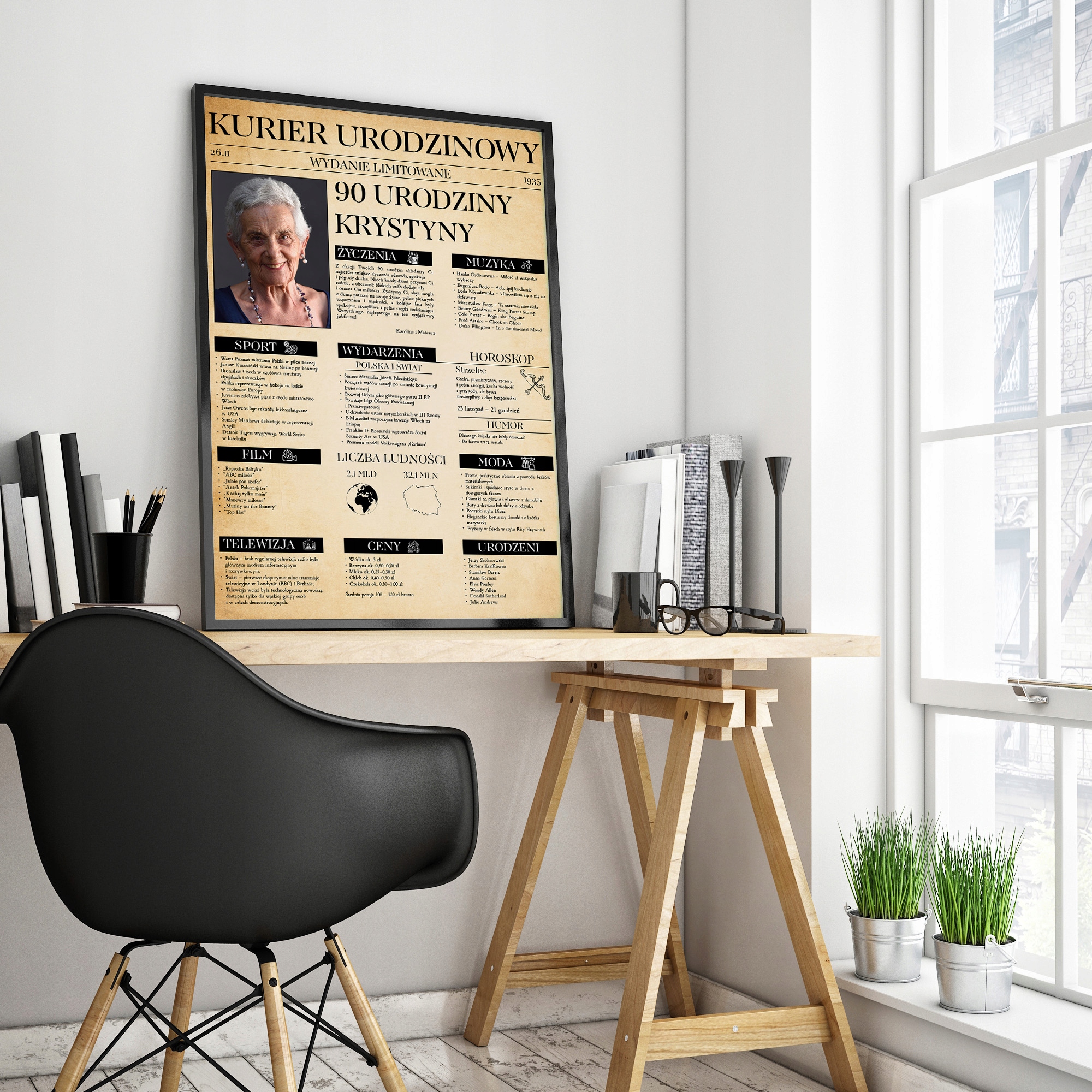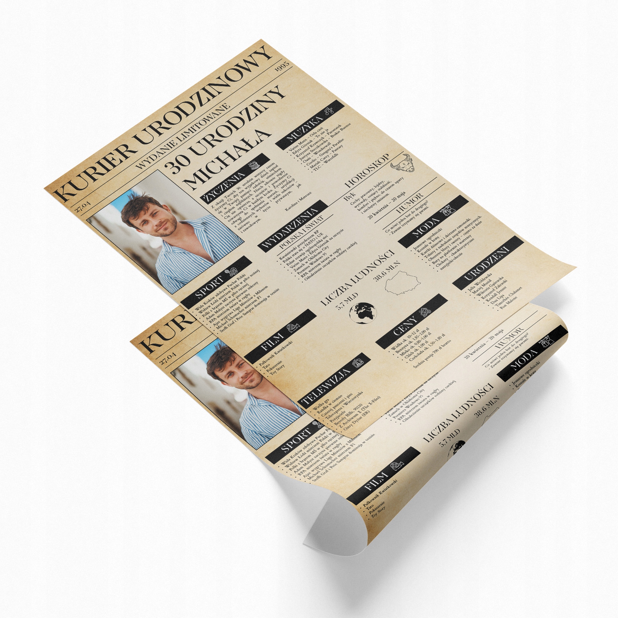 Ви шукаєте надзвичайний подарунок, який порадує іменинника і залишиться з ним довгі роки? Ми пропонуємо персоналізовану газету на день народження в ретро -стилі, обрамлену елегантною чорною рамкою.