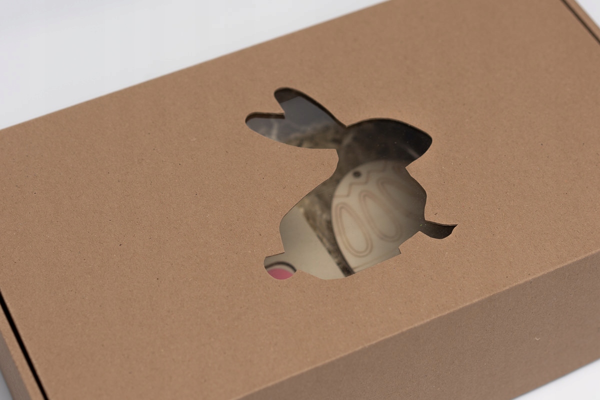 Ціле упаковане в вирізану коробку з вікном у формі зайчика (вистеленим екологічним наповнювачем), пов'язаним стрічкою (колір стрічки, щоб вибрати з кольорів, показаних на фотографії нижче).