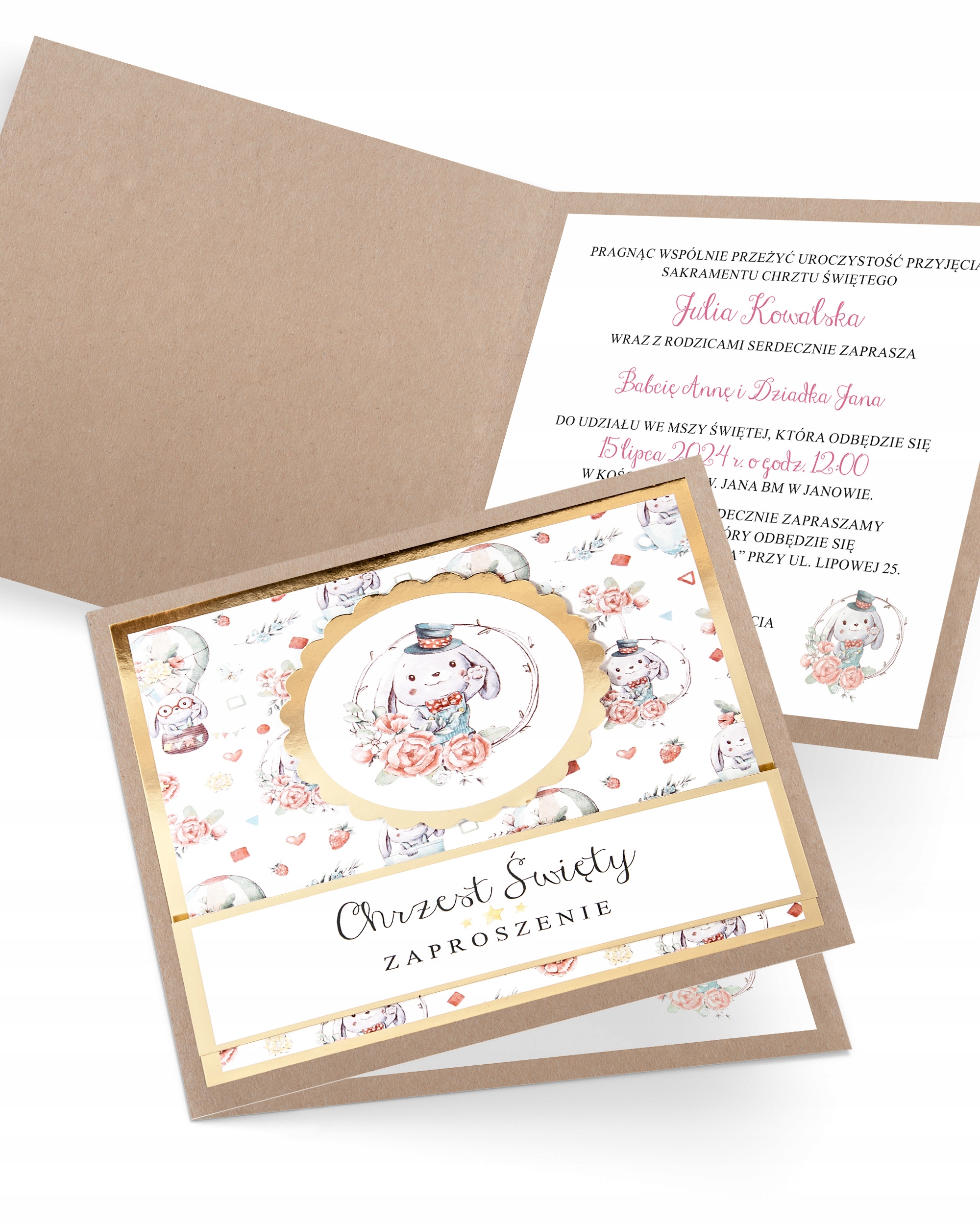 Запрошення на хрещення «Little Gentleman Gold» — це унікальне запрошення з чарівним рослинним мотивом, де листя та ніжно-рожеві квіти створюють красивий, приглушений візерунок. Все це було збагачено золотом, блискучим папером і чарівною графікою зайчика в капелюшку, що надає запрошенню легкості та чарівності дитячого світу.