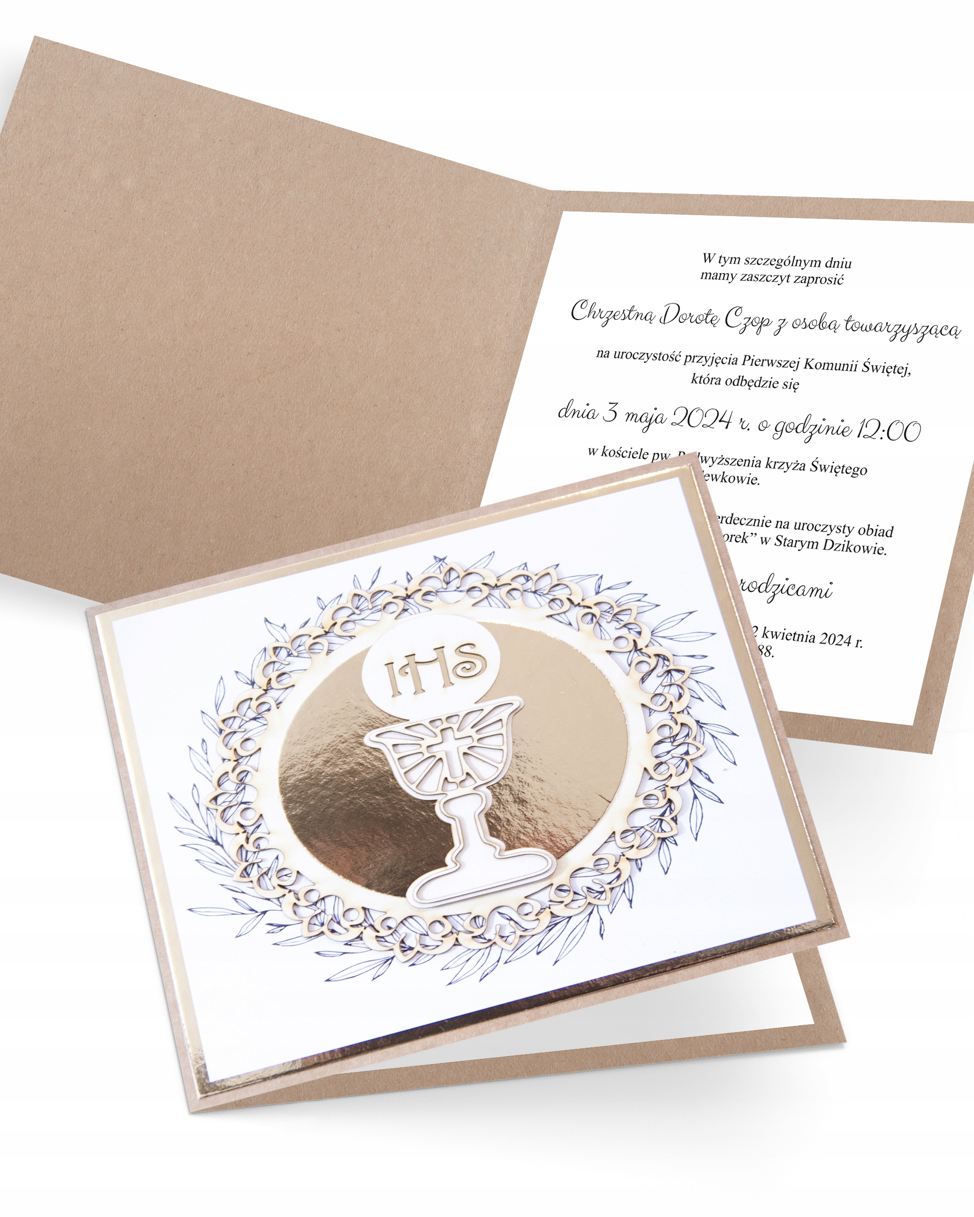 Запрошення до Святого Причастя "Квітковий кадр -господар" - це композиція, зроблена з увагою до кожної деталі. Кремовий орнаментований картон має господар, що складається з двох нанесених елементів, що вводить у проект тривимірність. Золотий, глянсовий папір додає шляхетності, підкреслюючи унікальний персонаж у цей день. Передня частина запрошення була прикрашена малюнком овочевого вінку, надрукованого на білому папері. Весь був укладений на золоту рамку та розміщений на універсальному та екологічному екологічному папері. > Можливість персоналізації запрошення! > конверт Gramage: 120 г /м2