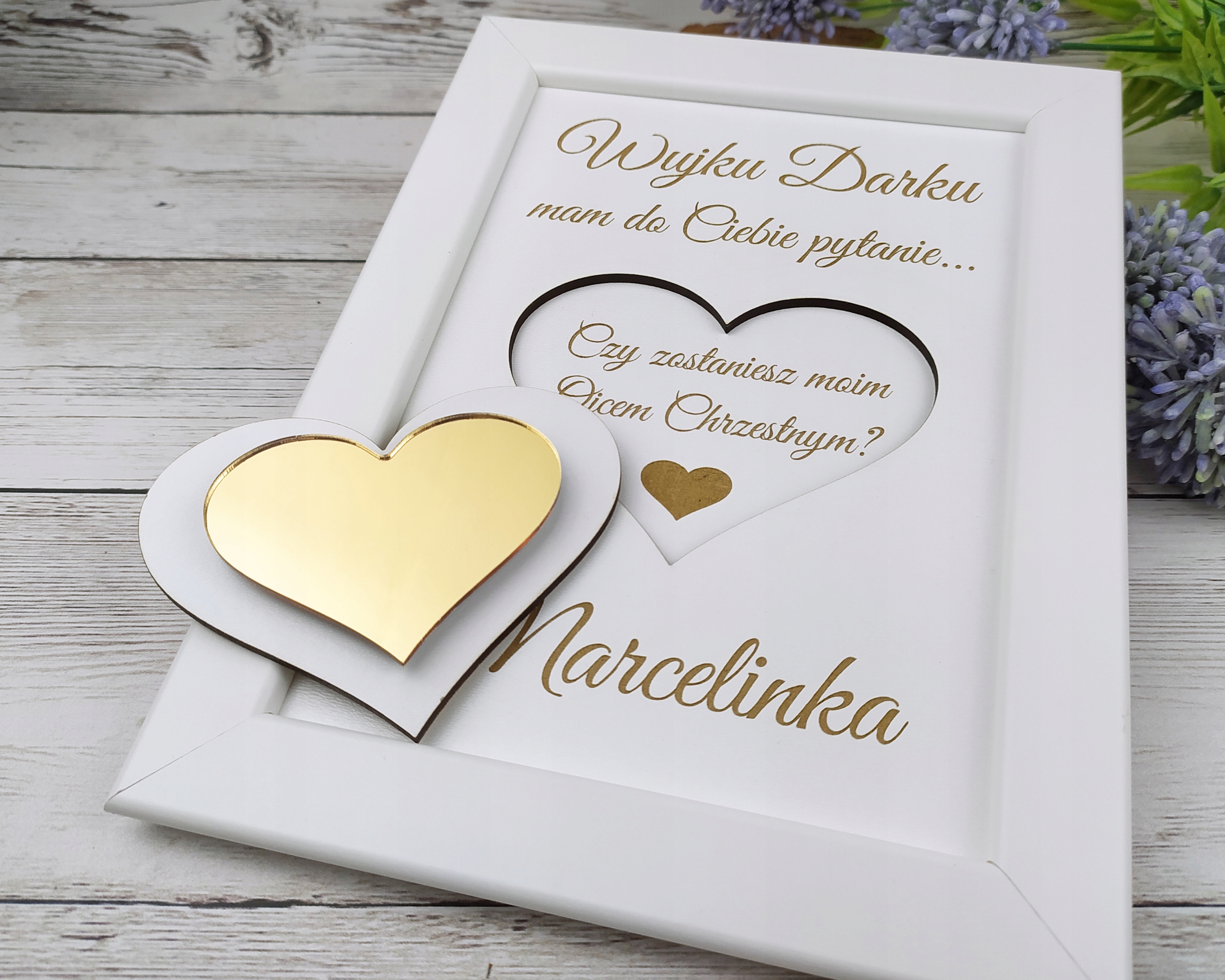 ❤️ Елегантний дизайн - рамка з дерева класичного білого кольору, прикрашена точно виконаним гравіюванням із запитанням: "Чи будеш ти моєю хрещеною?" Тонкий золотистий акцент у вигляді сердечка, що знімається, додає неповторний шарм і символізує емоції, пов'язані з цим особливим моментом. Після вилучення серця з'являється зворушливе питання, яке торкається серця кожного, хто його бачить.