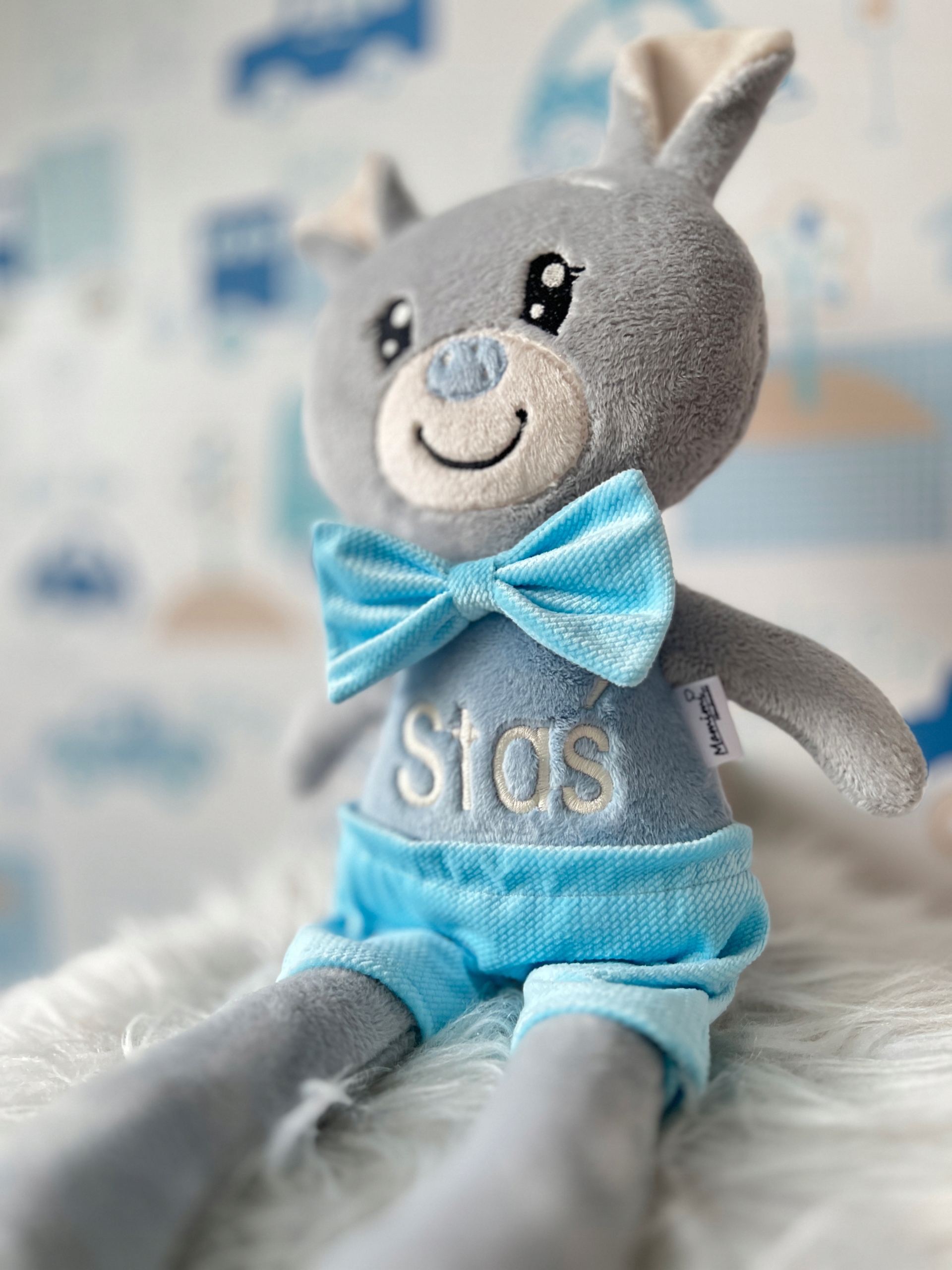 Ведмедик виготовлений з матеріалів найвищої якості (м'який фліс minky - вага 380г - сірого, блакитного та кремового кольорів, антиалергічний наповнювач - силіконова кулька). Матеріали сертифіковані Oeko-Tex Standard. У ведмедика вишита мордочка та очі, тому він безпечний для дитини.