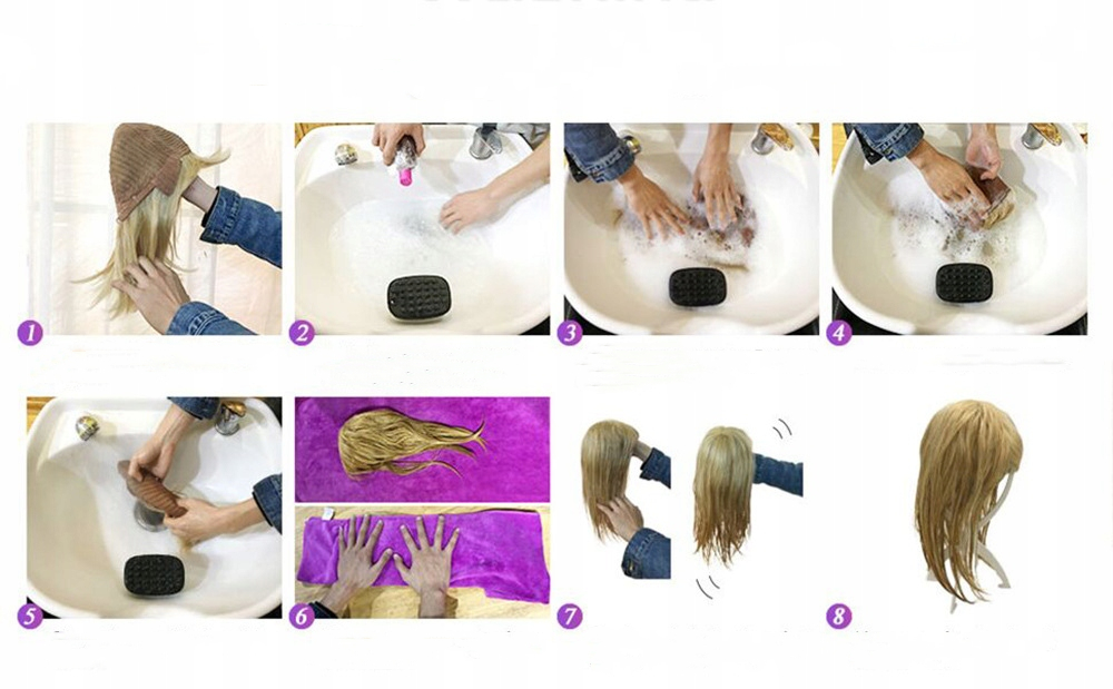- Для чищення використовуйте невелику кількість м’якого шампуню в холодній або теплій воді, потім замочіть перуку приблизно на 10–15 хвилин, обережно витріть вологу на перуці рушником, не тріть її занадто сильно, і покладіть її на підставку для перуки, доки вона не висохне природним шляхом. Ви також можете висушити його менш гарячим повітрям фена. Ви також можете використовувати спеціальні засоби для догляду за перуками, щоб довше підтримувати їх у хорошому стані.