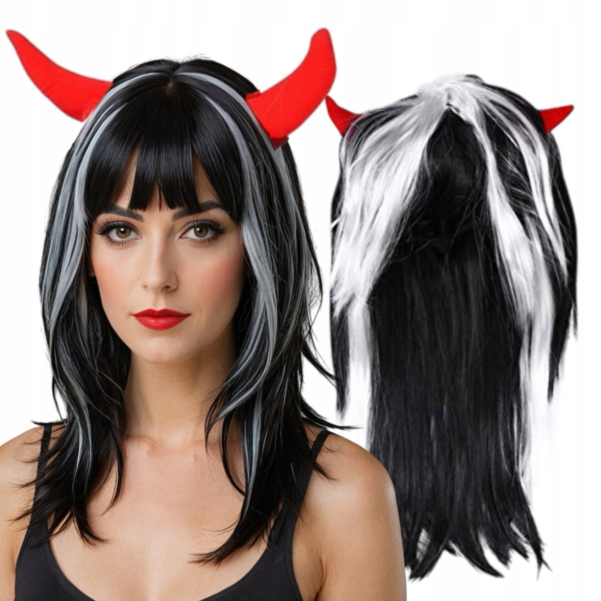 ПЕРУКА ДИЯВОЛА РОГИ, ЧОРНЕ ДОВГЕ ВОЛОССЯ З БІЛИМИ РОГАМИ ДИЯВОЛА