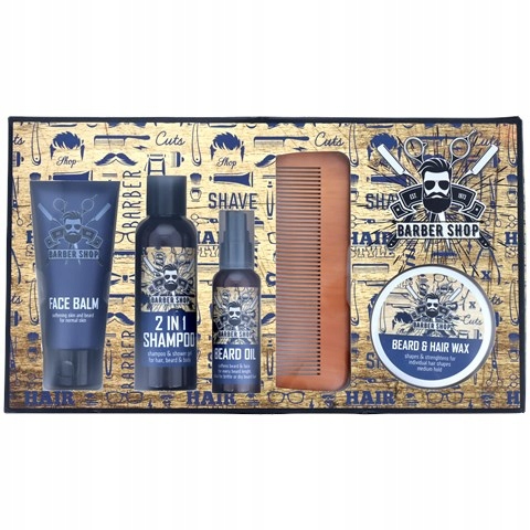 Barber Shop - це набір з чотирьох косметичних засобів, необхідних для підтримки вашої бороди, волосся та обличчя в хорошому стані. Зберігає ваше волосся на обличчі чистими та живить цілий день. Крім того, зволожує шкіру обличчя. Стильна упаковка та елегантний аромат роблять набір унікальним подарунком для кожного бороданя!