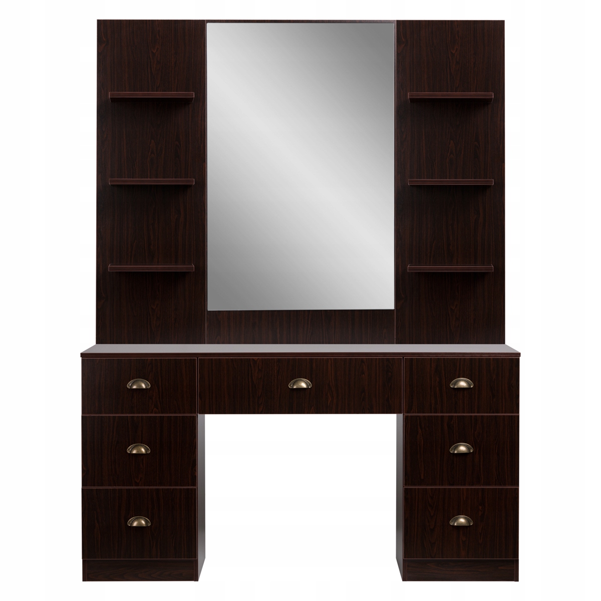 Елегантна перукарська консоль кольору венге з латунним покриттям. Велике дзеркало, полиці та ящики забезпечують функціональність. Оздоблення найвищого класу. Гарний предмет меблів і водночас універсальний елемент інтер'єру, який підкреслить характер будь-якої вітальні.