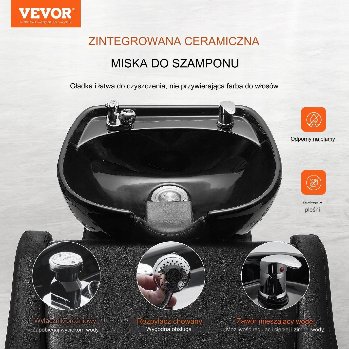 Підвищте якість свого салону за допомогою високоякісного крісла для ополіскування шампуню VEVOR. Він має гладкий керамічний умивальник, який легко миється та стійкий до плям від фарби для волосся. Додаткову зручність забезпечують висувний розпилювач, клапан, який змішує гарячу та холодну воду, і вакуумний перемикач, який запобігає витоку води.