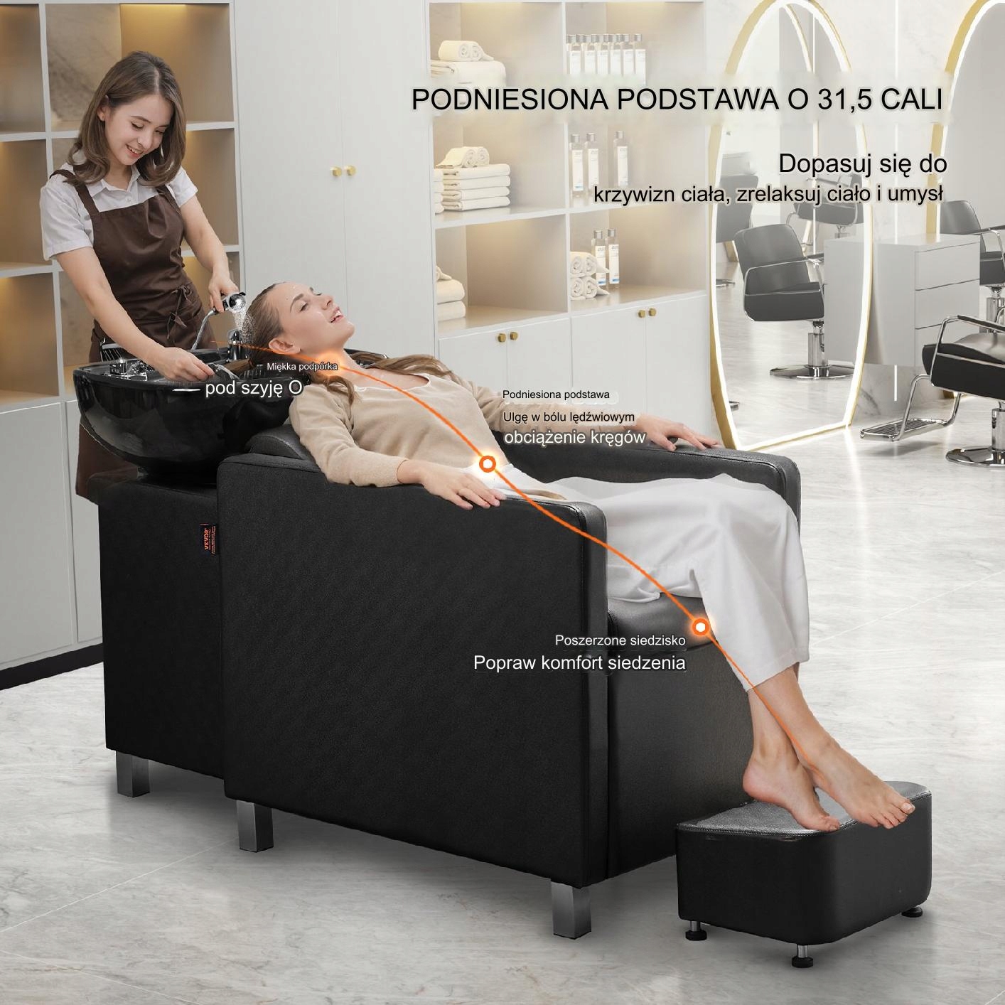 Це крісло для миття шампуню має керамічну миску, вантажопідйомність 300 кг, електрично регульовану підставку для ніг і сидіння з поліуретанової шкіри для виняткової м’якості, комфорту та стабільності.