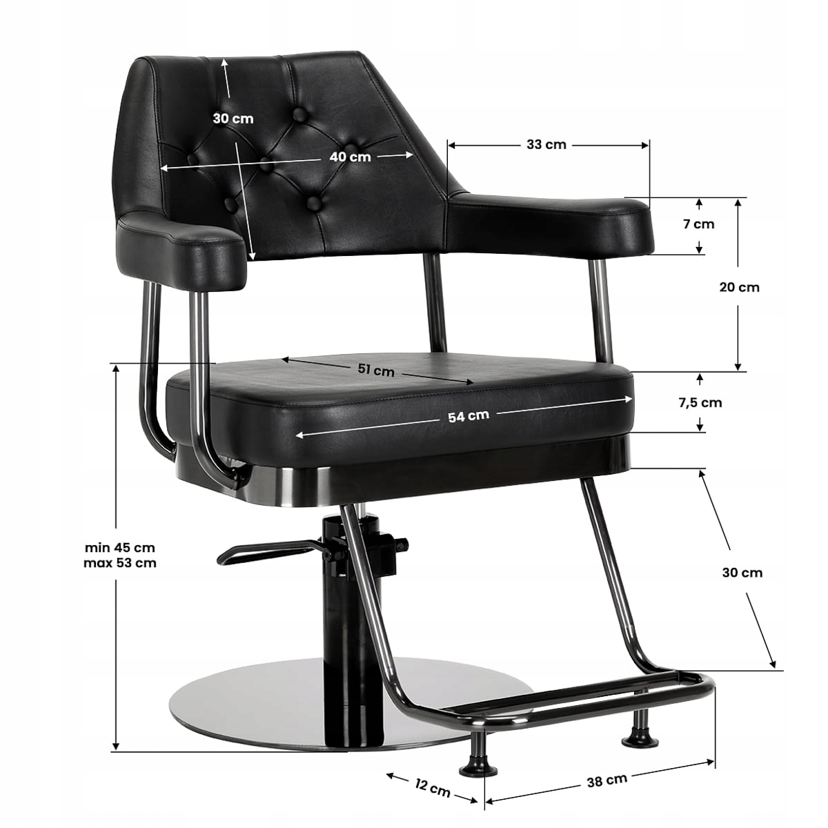 Стійкий гідравлічний підйомник дозволяє регулювати рівень сидіння в межах 45-53 см, навіть коли клієнт сидить на стільці.