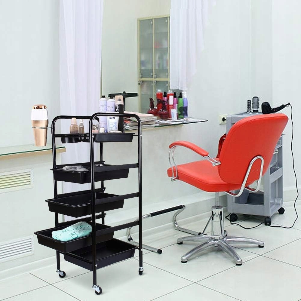 Верхня частина візка обладнана різними відділеннями та виїмкамиу який ви можете легко помістити фарби, пляшки та професійні продукти, необхідні за потреби, а також має практичний тримач для фена.