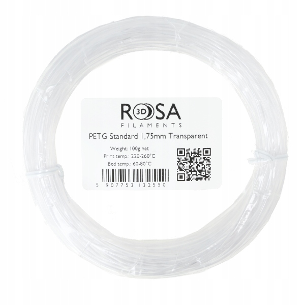 Заправка нитки PET-G Standard від ROSA3D. Філамент характеризується простотою друку, порівнянною з PLA. Присвячується людям, які займаються аматорським та професійним 3D-друком. Деталі з PET-G Standard відрізняються чіткістю деталей, хорошим зчепленням з робочим столом, відсутністю запаху та малою усадкою. Відбитки з PET-G Standard відрізняються високою хімічною стійкістю.