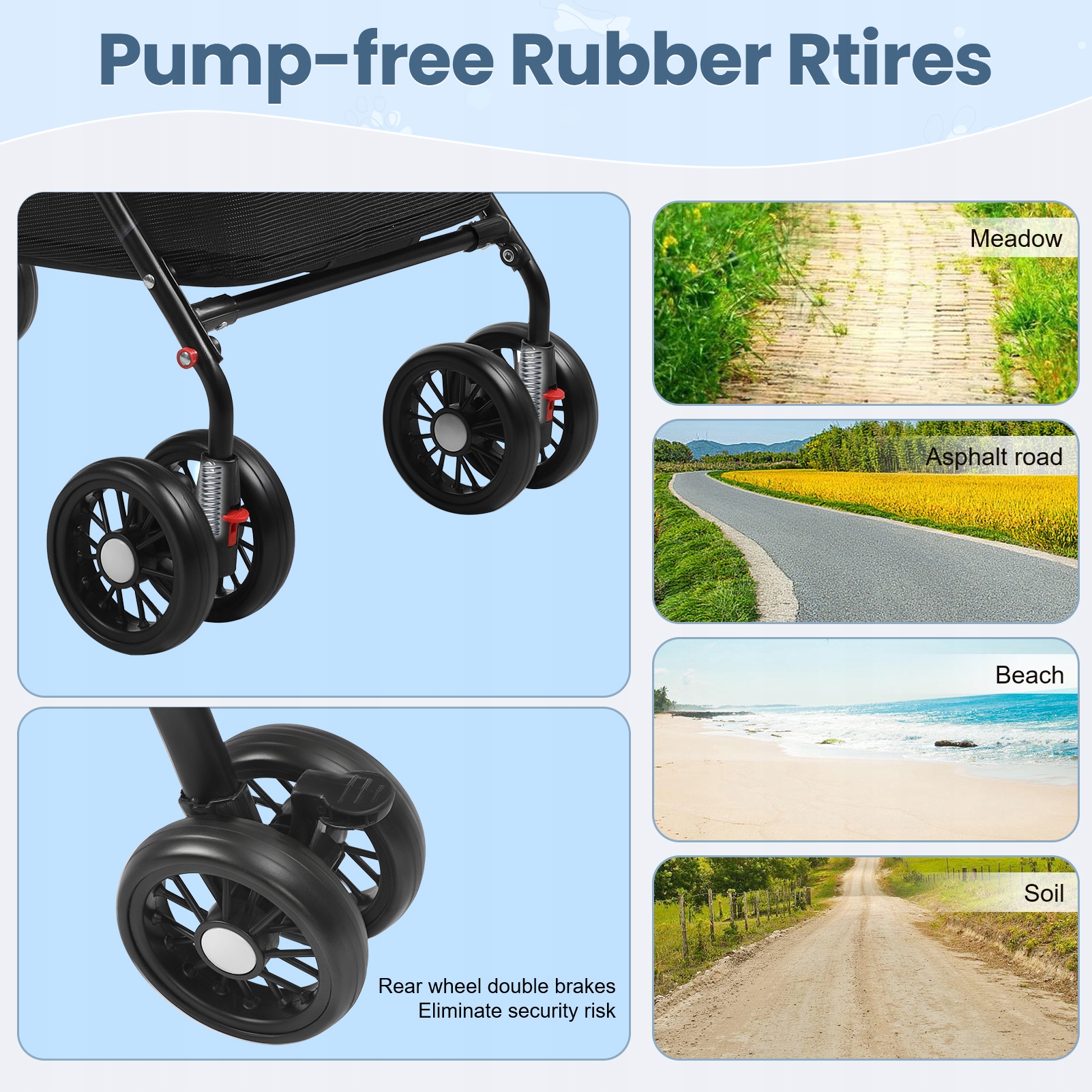Ця коляска для тварин може задовольнити потреби домашніх тварин завдяки просторому простору. З регульованим сонцезахисним козирком, передніми та задніми вхідними дверима та поворотними на 360 градусів амортизаторами, які можна адаптувати до різноманітних рельєфів, він розроблений з урахуванням комфорту та затишку. Ця коляска для домашніх тварин, оснащена гальмами на задніх колесах і мотузками, що запобігають втечі, забезпечує безпеку та знижує ризик падіння на домашніх тварин.