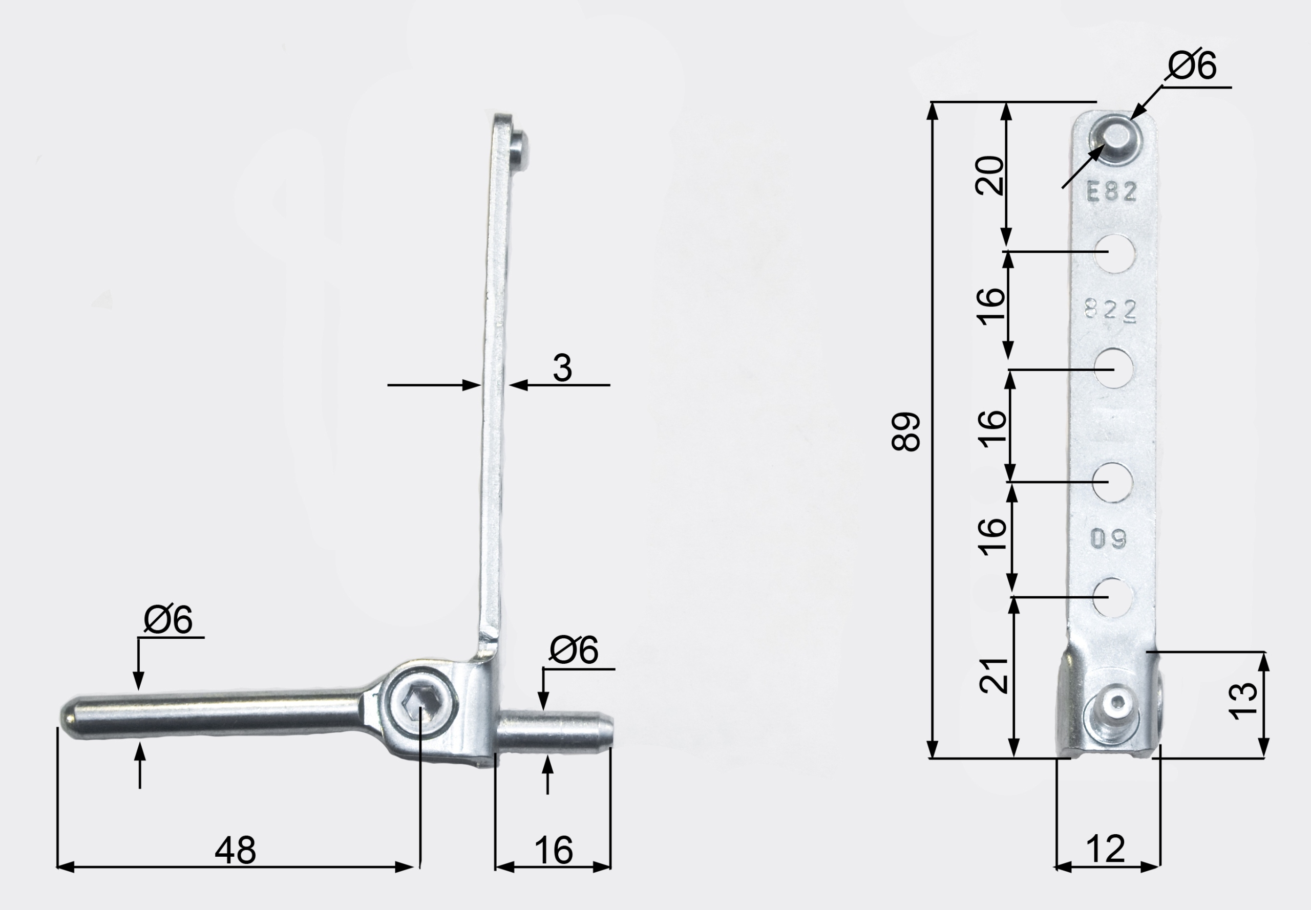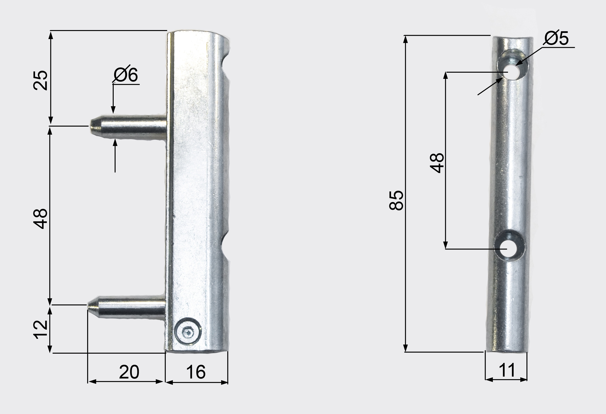 Опис: петля виготовлена з оцинкованого металу. Це нижня віконна петля. Нижня частина петлі прикручується до віконної рами 4 шурупами, а верхня частина кріпиться до стулки вікна 2 шурупами. Додатково в нижній частині петлі є 2 шпильки (нижня велика і верхня маленька), які визначають положення петлі і запобігають її опусканню. Верхня частина петлі також має 2 шпильки, які визначають положення петлі і запобігають звисанню стулки. Цей тип петлі найчастіше використовується у вікнах ПВХ. Петля розрахована на стулку максимальною вагою 100 кг. Петля дозволяє регулювати вікно по горизонталі (нижня частина петлі) і по вертикалі (верхня частина петлі).