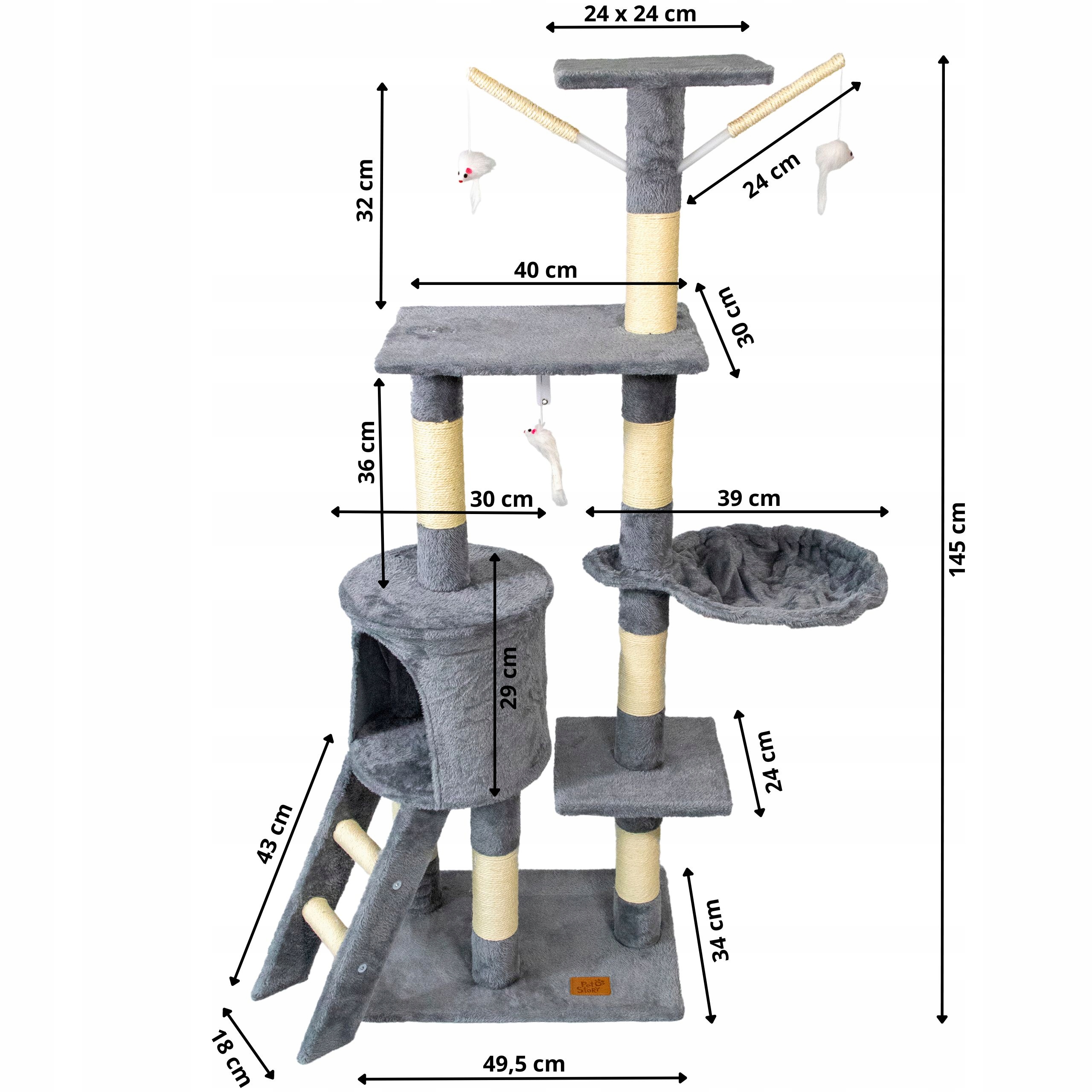 Основа має три стовпи та драбину, які загорнуті в натуральна тканина зсизалюідеально підходить для дряпання та догляду за нігтями. Додаткові атракціони, такі як підвішені іграшки, заохочують активну гру, стимулюючи мисливські інстинкти кота.