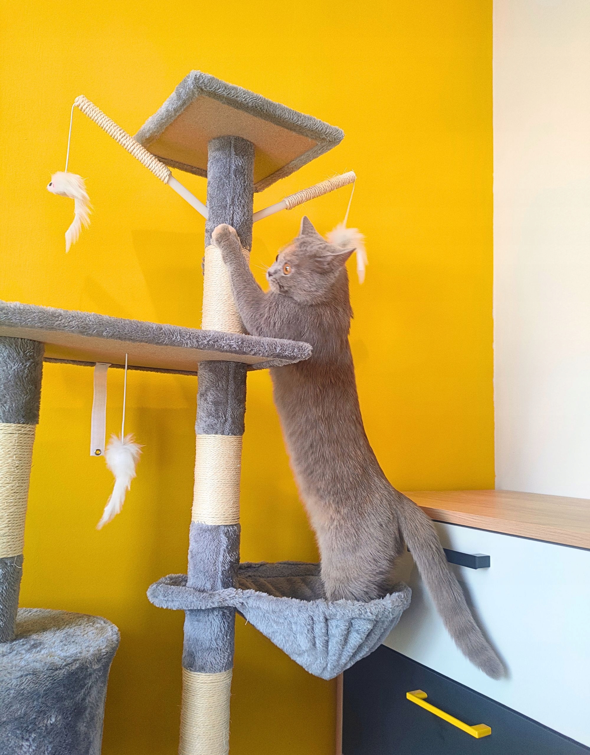Міцна основа не тільки забезпечує стабільність всієї конструкції, але також служить зручним місцем для лежання та дрімання. Платформа, покрита м’яким сірим плюшем, дарує комфорт і тепло.