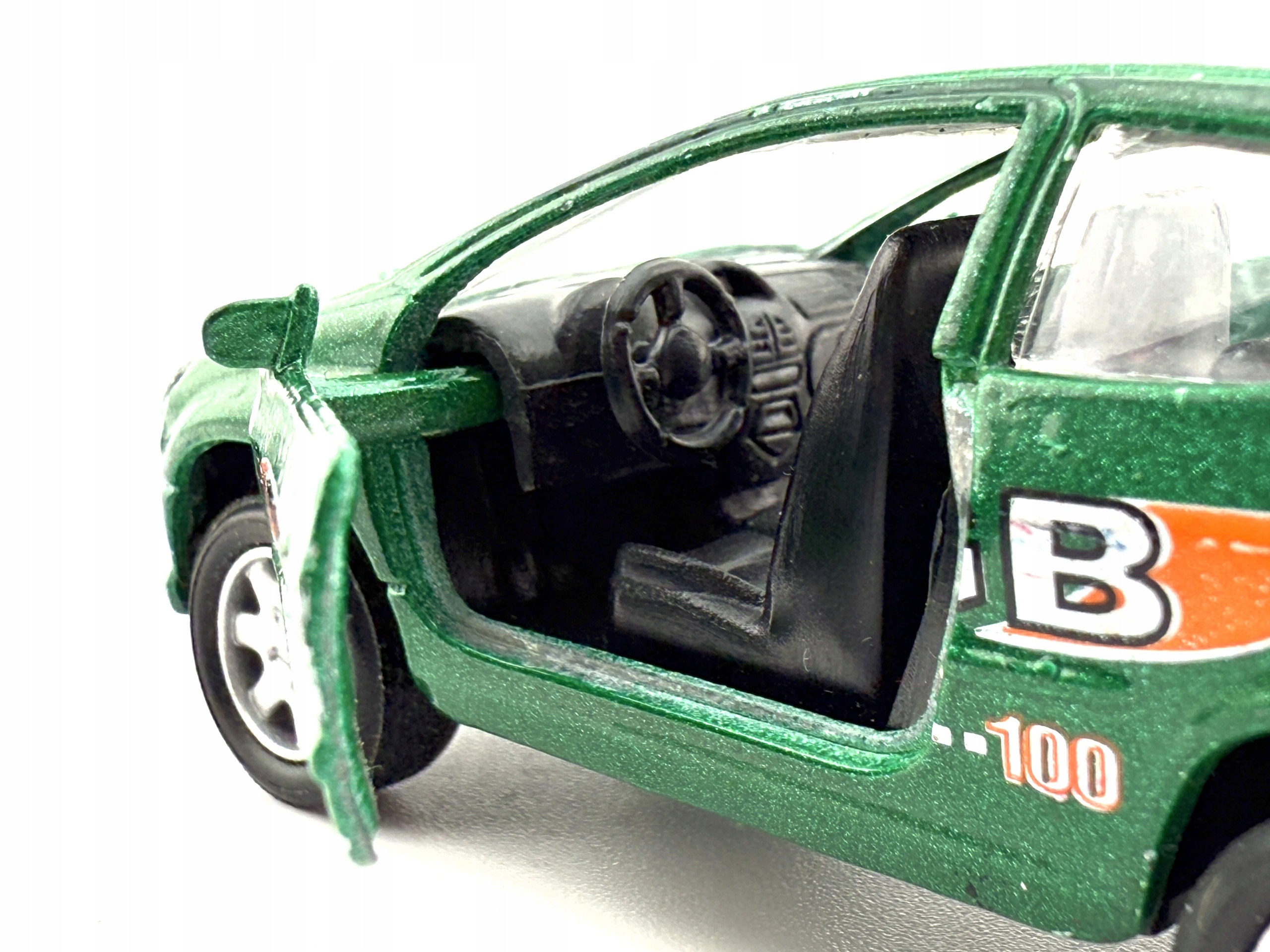 Peugeot 206 у весняній версії від Majorette - це модель, яка привертає увагу своїм металевим зеленим кольором, доповненим помаранчевими та чорними акцентами. Двері відкриття дають їй інтерактивність, яка рідкісна в цій категорії. Модель виготовлена з металу та пластику, що забезпечує міцність та естетичний вигляд. З деталями, такими як номер 100 на даху, ця весна стає цікавим елементом кожної колекції. Незважаючи на незначні ознаки використання, його загальний стан хороший, що робить його привабливим для колекціонерів.