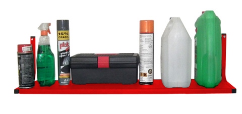 Полиця PG1 ідеально підходить для зберігання аксесуарів для гаража. Виготовлений з листового металу, пофарбований порошковою фарбою червоного кольору. Структура лаку запобігає ковзанню предметів на полиці. Кріпиться до стіни двома гнутими кронштейнами, також пофарбованими в червоний колір. Завдяки використанню відповідних матеріалів наш виріб має високу міцність, прослужить багато років і забезпечить порядок у гаражі.