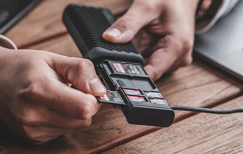 Пристрій зчитування карт пам’яті PGYTECH CreateMate — ідеальний інструмент для фотографів, кінематографістів тощо. Він забезпечує блискавичну передачу файлів зі швидкістю до 312 МБ/с, а завдяки системі Plug & Play його робота дуже зручна. Пристрій також дозволяє зберігати до 8 карт пам'яті (4 SD-карти і 4 TF-карти) і 2 Nano SIM-карти. Він також виділяється широкою сумісністю та міцною конструкцією. У комплект також входить силіконовий чохол і ключ для вилучення карт.