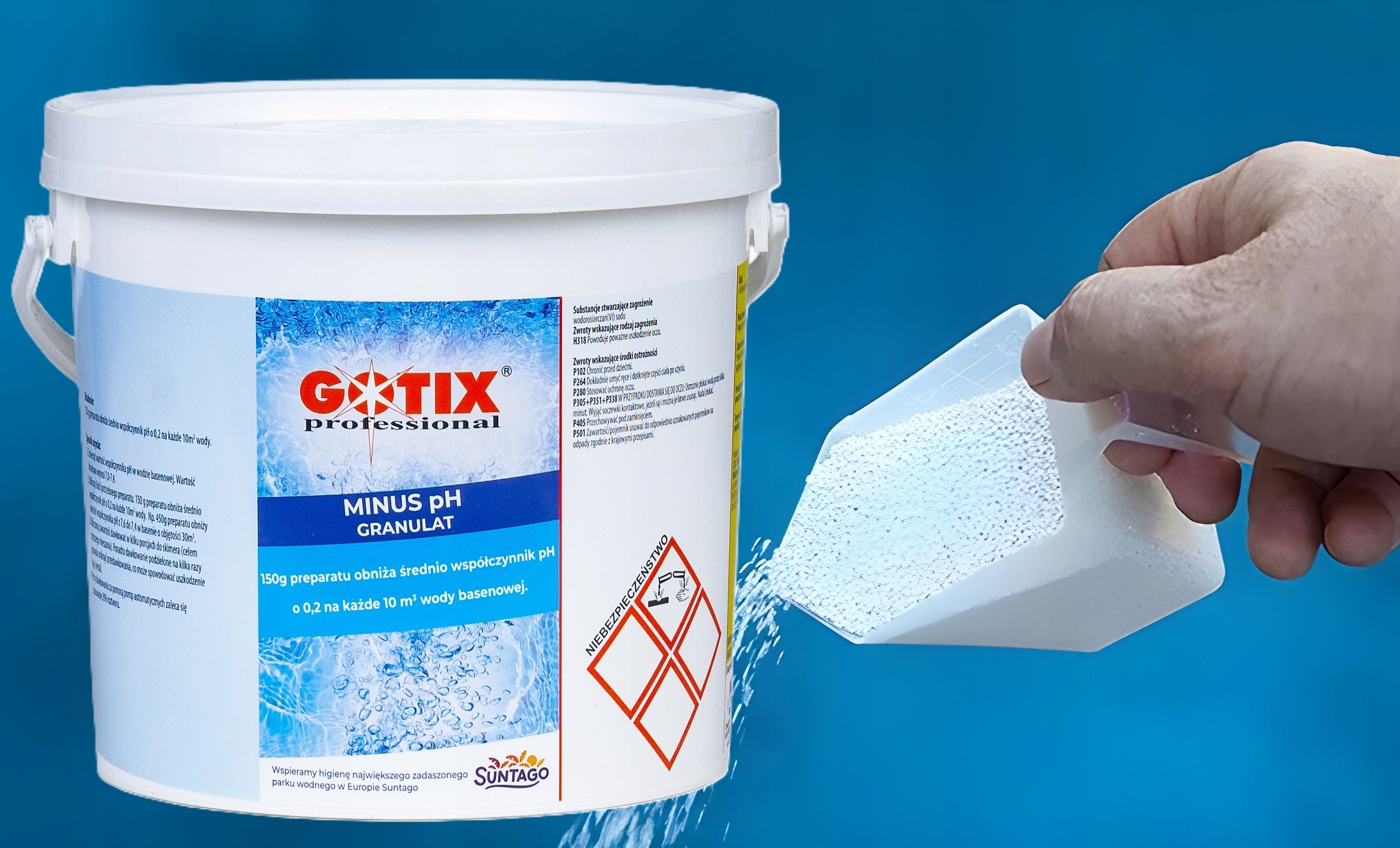 Для зниження значення pH використовується кислотний препарат MINUS PH GOTIX PROFESSIONAL у формі гранул. у воді басейну до ідеального діапазону 7, 0 - 7,4. Оптимальне значення PH становить від 7,0 до 7,4, тобто стільки ж, скільки людська сльоза. Отримання значення PH у вказаному діапазоні є необхідним для належної роботи інших хімікатів басейну.