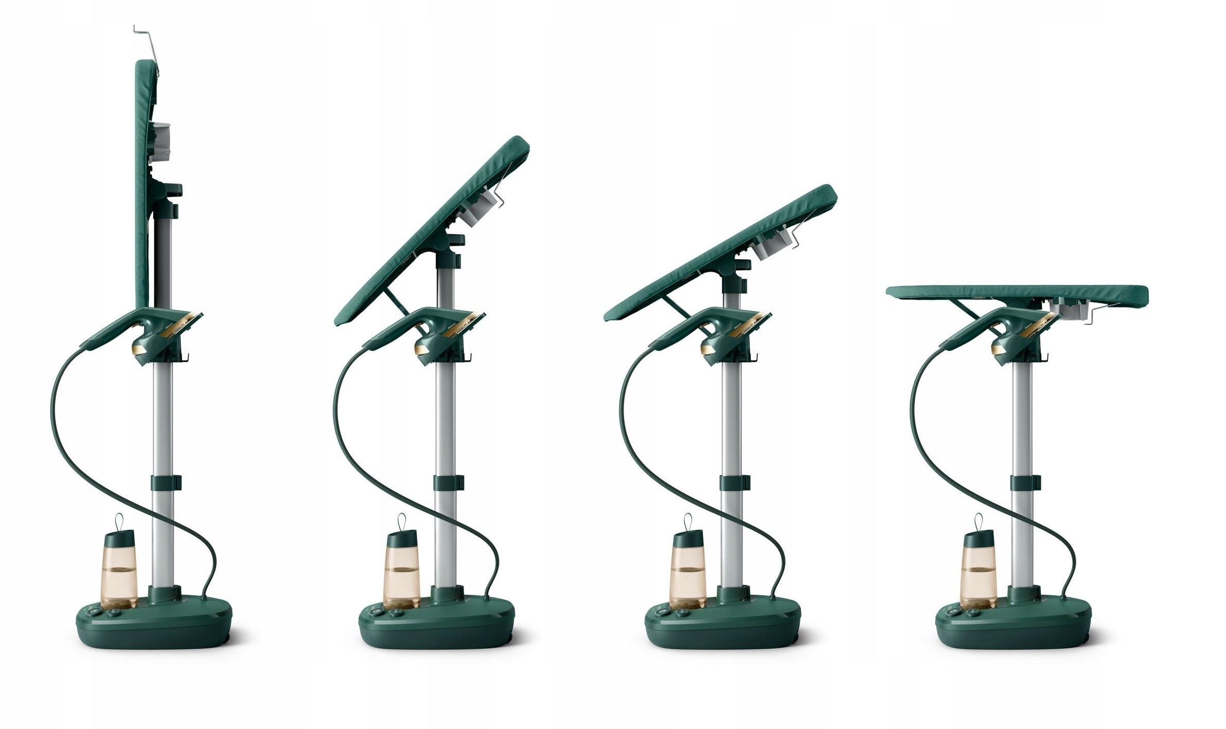 прасувальна дошка може бути встановлена в будь -якому положенні у багатьох кутах, що забезпечує зручне використання . Горизонтальне положення буде ідеальним для прасування жорстких тканин та вертикалі для випаровування ніжного одягу.