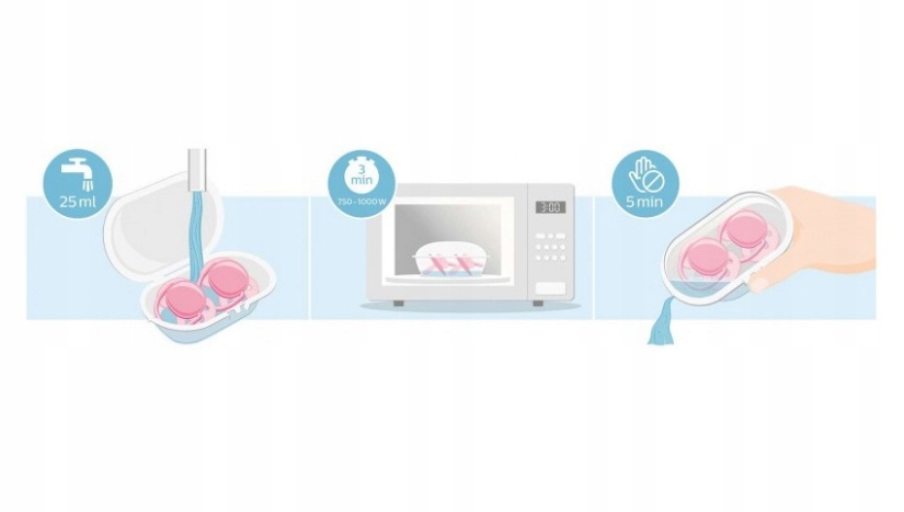 Все, що вам потрібно зробити, це додати трохи води та поставити її в мікрохвильову піч. Після цієї процедури ви можете бути впевнені, що пустушка чиста та готова до повторного використання.