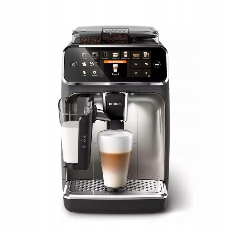 Повністю автоматичне літнє молоко з молочним модулем та програма для автоматичного очищення залишків молока також заслуговує уваги. Підтримується поступове регулювання потужності напою (5 варіантів), об'єм та температури кави (3 варіанти). Кавоварка Philips EP 5447 оснащений автоматичною шліфувальною машиною з надійними керамічними травами та контрольованою товщиною шліфування (5 рівнів). Ефективний обігрівач потоку з 1500 Вт та насос, призначений для максимального тиску 15 бар, забезпечується швидкою підготовкою та високим ступенем вилучення. Повне навантаження (275 г зерен, 1,8 літра води) достатньо, щоб заварити 30-35 стандартного еспресо. Підтримується запам'ятовувати налаштування користувача (4 рецепти), щоб швидко підготувати свій улюблений напій. 4