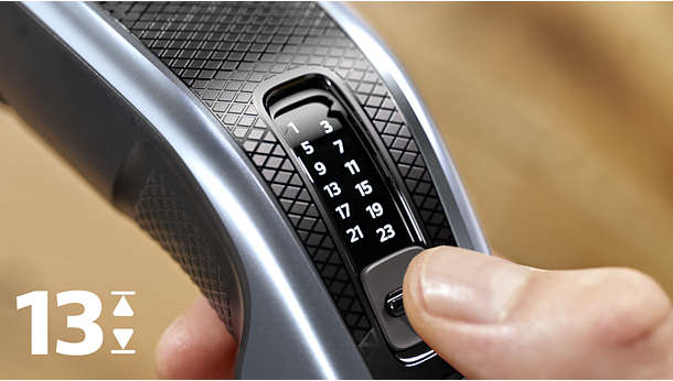 - Просто виберіть та заблокуйте бажану налаштування довжини. Регульований кріплення гребінця забезпечує 12 заблокованих налаштувань від 1 мм до 23 мм. Відстань між наступними налаштуваннями становить рівно 2 мм. Ви також можете зняти кріплення і ненадовго стригти волосся на довжину 0,5 мм.
