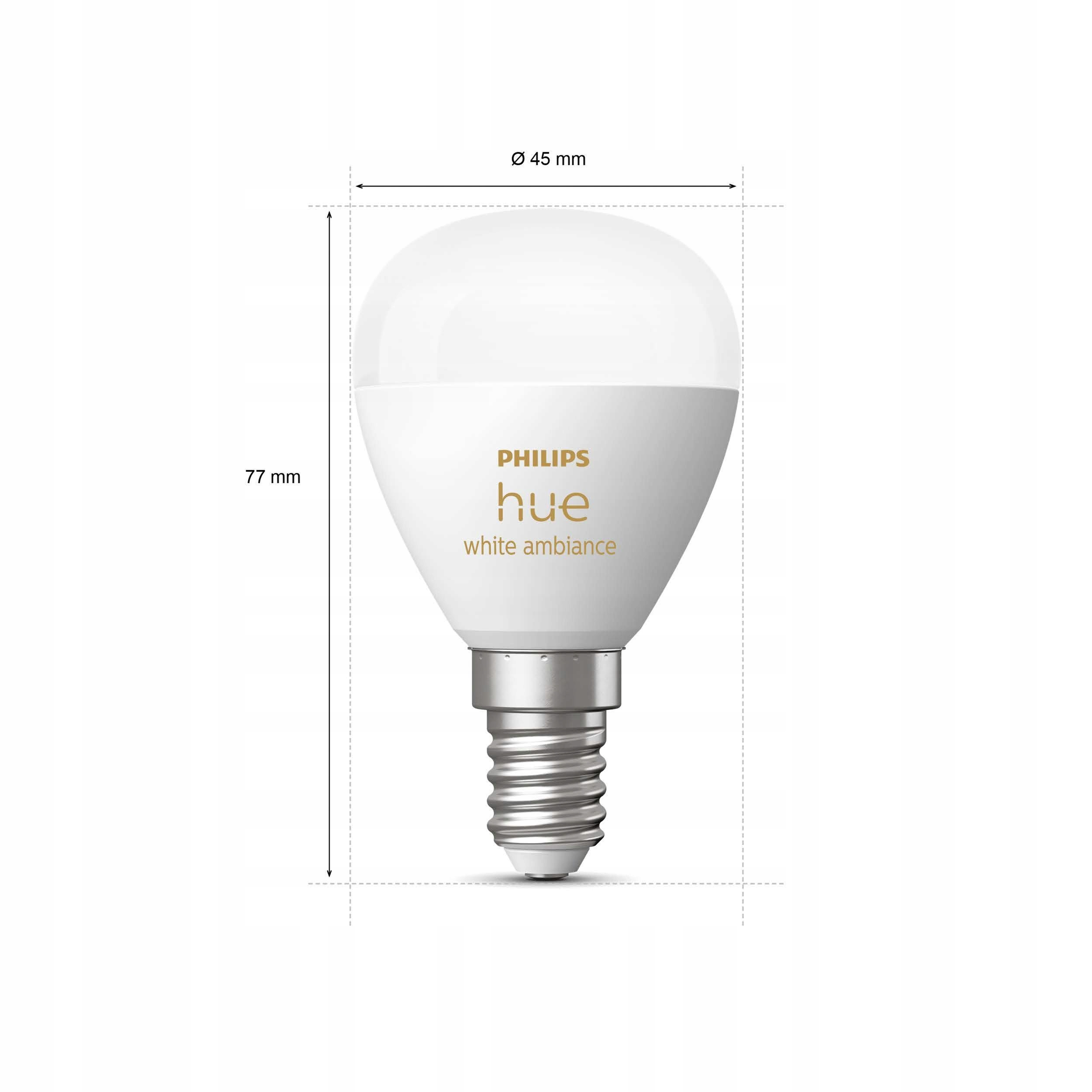 Відкрийте для себе майбутнє освітлення з лампочками Philips HUE! Представляємо набір інтелектуальних світлодіодних ламп E14 у формі маленької кульки P45, які пропонують сучасні рішення в області освітлення дому. З потужністю 5,1 Вт, що еквівалентно традиційним лампочкам 40 Вт, наші лампочки заощаджують енергію, зберігаючи ефективність. Технологія CCT (tunable white) дозволяє регулювати колір світла від теплого до холодного білого (2200-6500K), дозволяючи ідеально підбирати освітлення відповідно до вашого настрою та діяльності.