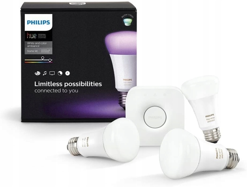 - Набір включає Hue Bridge і три світлодіодні RGB-лампи E27 з регулюванням яскравості.