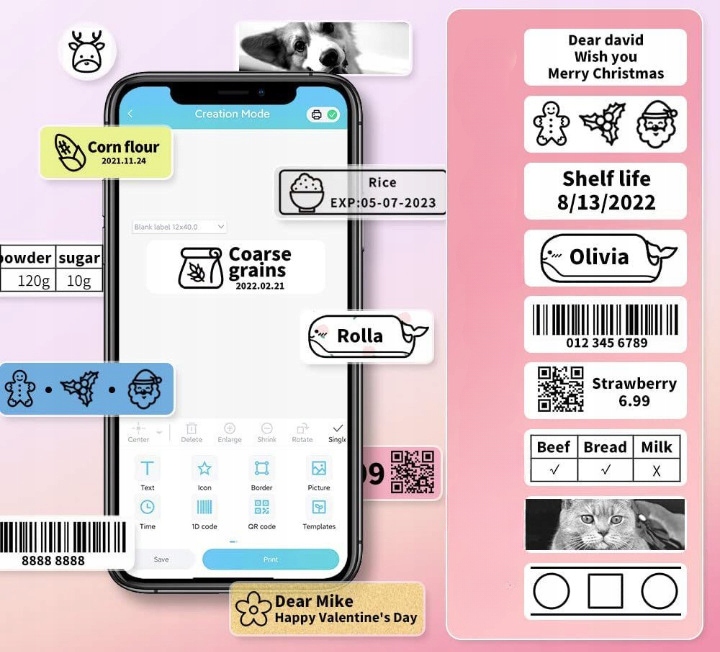 Принтер мітки підключається до вашого телефону за допомогою Bluetooth. Просто завантажте безкоштовну програму Print Master, увімкніть Bluetooth на телефоні та підключіться до однієї кнопки з пристроєм D30. Додаток містить велику кількість бібліотек матеріалу, кілька шрифтів, режими редагування тексту та інші функції.