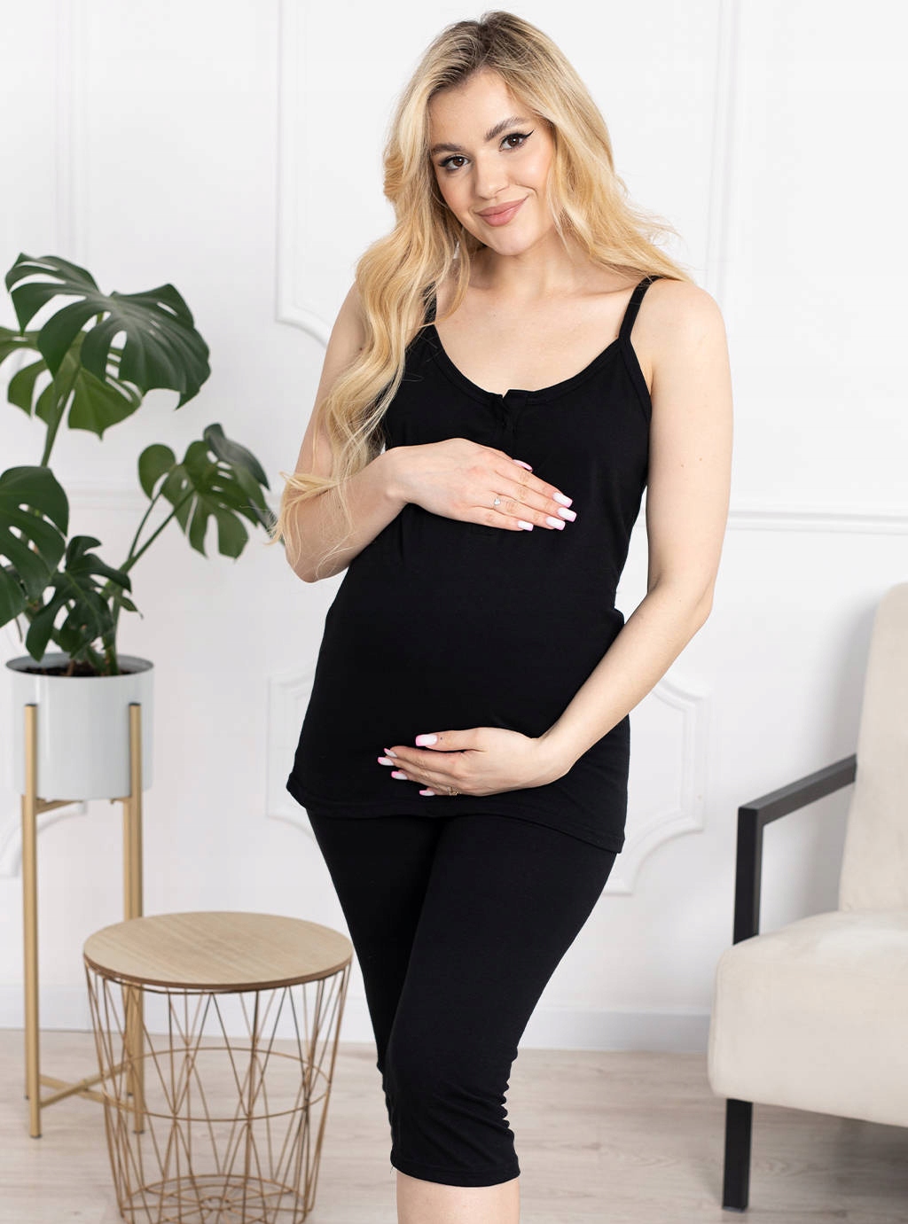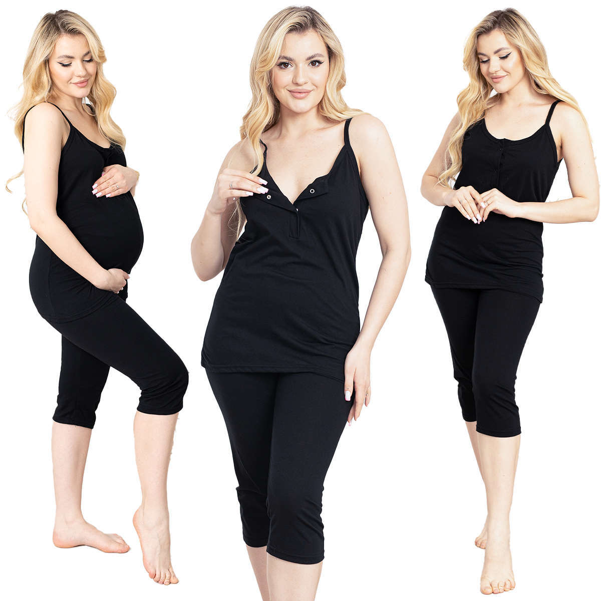 Піжама для вагітних Black складається з футболки та сітки. Футболка надзвичайно зручна завдяки блискавці посередині, що дозволяє швидко та без зусиль погодувати дитину. Шорти мають гумку, яка не здавлює живіт. Піжама ідеально підійде для теплих літніх днів і як елемент вашого гардеробу під час перебування в лікарні. Чорні піжами для годування надзвичайно елегантні та повітряні, а їх додатковою перевагою є довговічність, що обумовлено натуральною бавовною та польським виробництвом. Купуючи його, кожна мама може бути впевнена, що він буде ідеальним як під час довгих місяців вагітності, так і під час годування малюка.